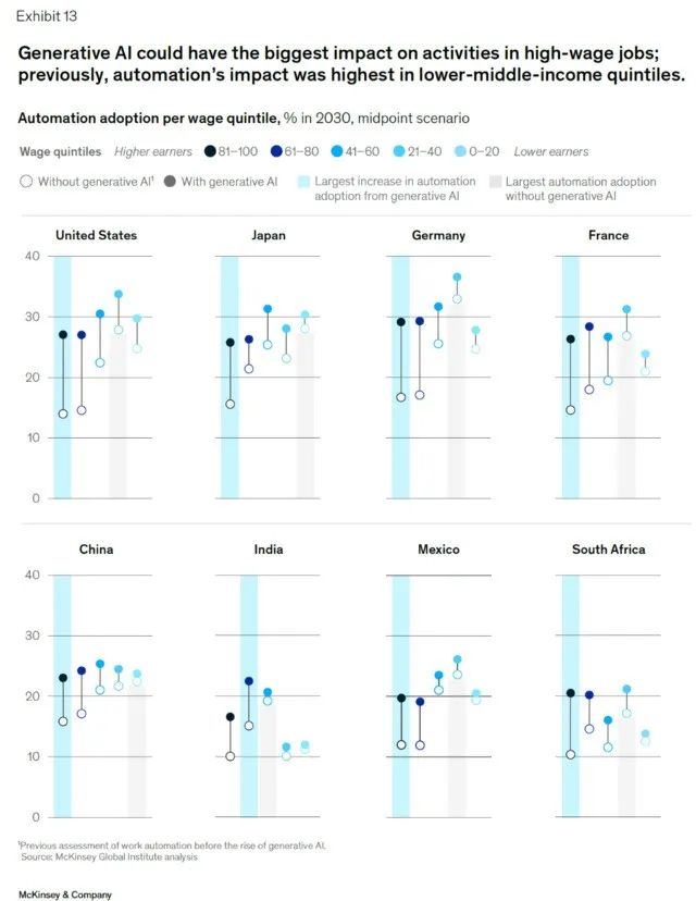 麦肯锡强调,值得注意的是,前几代的自动化变革往往对工资收入处于中间位置的职业影响最大,一些经济学家把这一现象比作:“中间层的空心化”,但现在AI的出现可能对高薪知识工作者的工作影响最大: