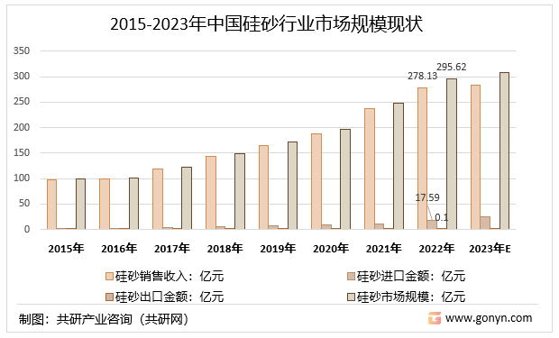 硅砂下游广泛应用于玻璃制品、耐火材料、航空航天、光伏、半导体等领域,近年来,随着下游细分行业的快速发展,硅砂行业市场规模不断增长。2022年中国硅砂销售收入278.13亿元,进口金额17.59亿元,出口金额0.1亿元,市场规模295.62亿元;预计2023年中国硅砂销售收入283.09亿元,进口金额25.48亿元,出口金额0.11亿元,市场规模308.46亿元。