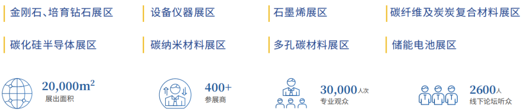 10+ 碳材主题论坛、20+Workshop/ 圆桌讨论 -- 论坛内容和形式焕然一新,涵盖石墨烯、碳纳米管、金刚石材料与器件、超精密加工、培育钻石、碳点、碳化硅半导体、碳基储能、碳纤维及其复合材料、炭 / 炭复合材料和多孔碳材料等前沿方向。