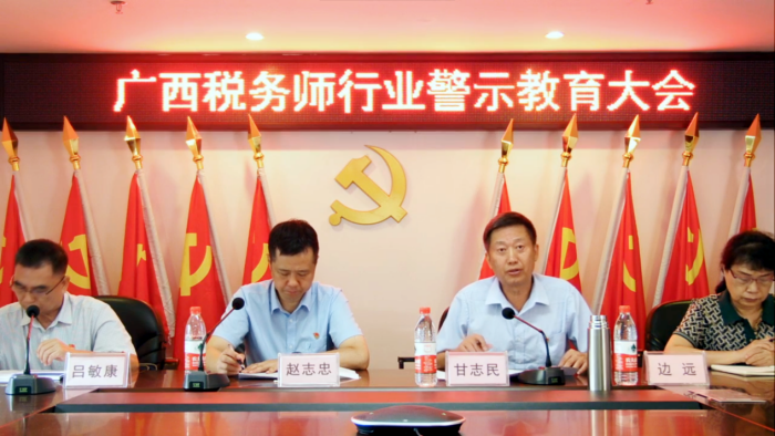甘志民在讲话中表示,召开广西税务师行业警示教育大会是广西注册税务师行业党委深入开展主题教育、认真贯彻中共中央办公厅、国务院办公厅《关于进一步加强财会监督工作的意见》的具体举措,目的是要推动广西税务师行业警示教育常态化,运用违法违规典型案例和身边人、身边事,以案为鉴、以案促改、以案为治,引导行业从反面典型案例中吸取教训,做到受警醒、明底线、知敬畏,自觉遵守法律法规、严守职业道德规范,主动在思想上划出红线、在行为上明确界限,用实际行动建设风清气正的税务师行业,为构建更加公平、公正的经济环境贡献力量。