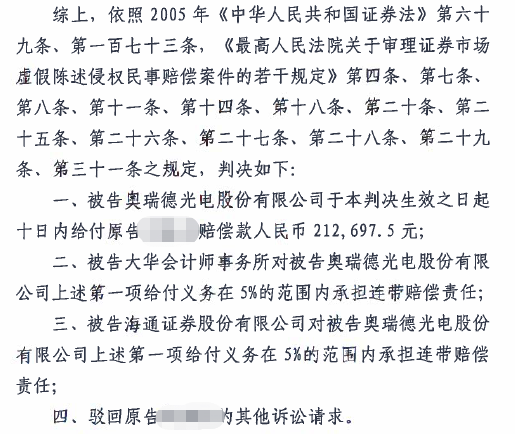 2022年12月23日,林日升律师团队分别收到黑龙江哈尔滨市中级人民法院民事一审判决书,判决被告奥瑞德光电股份有限公司(证券代码:600666)向原告赔偿投资差额损失,同时判决会计师事务所、证券公司对前述赔偿义务在5%范围内承担连带赔偿责任。附判决部分: