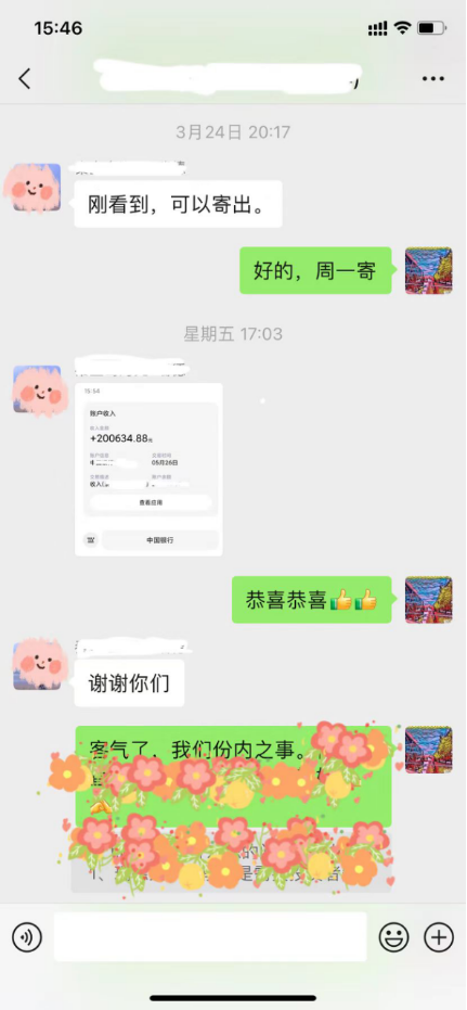 2023年2月本团队向奥瑞德光电股份有限公司管理人邮寄债权申报文书,于3月收到《债权确认单》,该位委托人于5月份获得债权清偿: