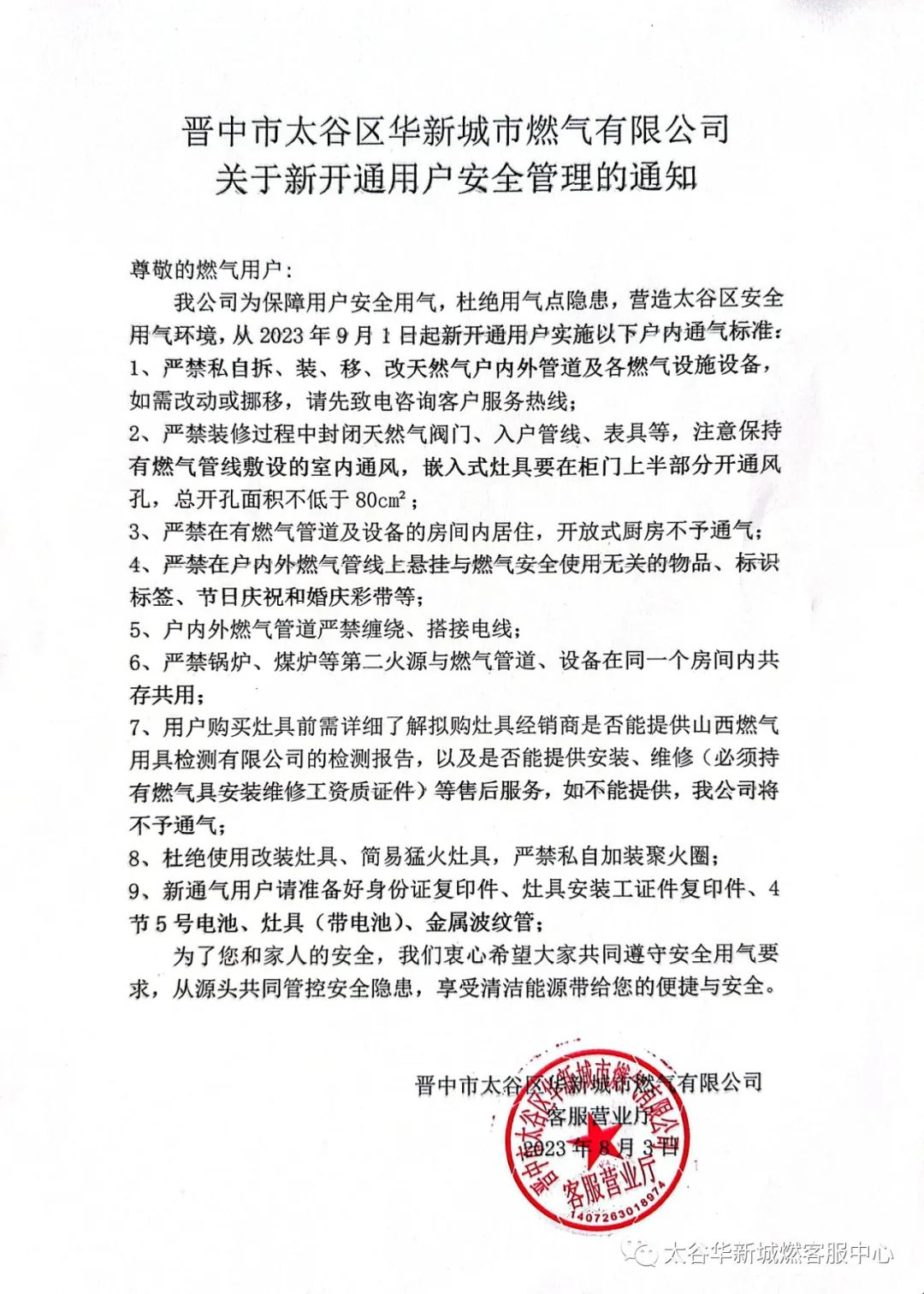 晋中市太谷区华新城市燃气有限公司关于新开通用户安全管理的通知