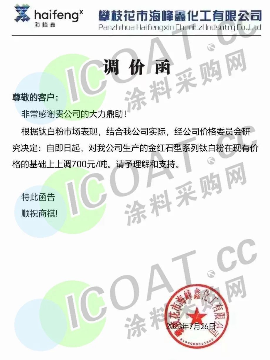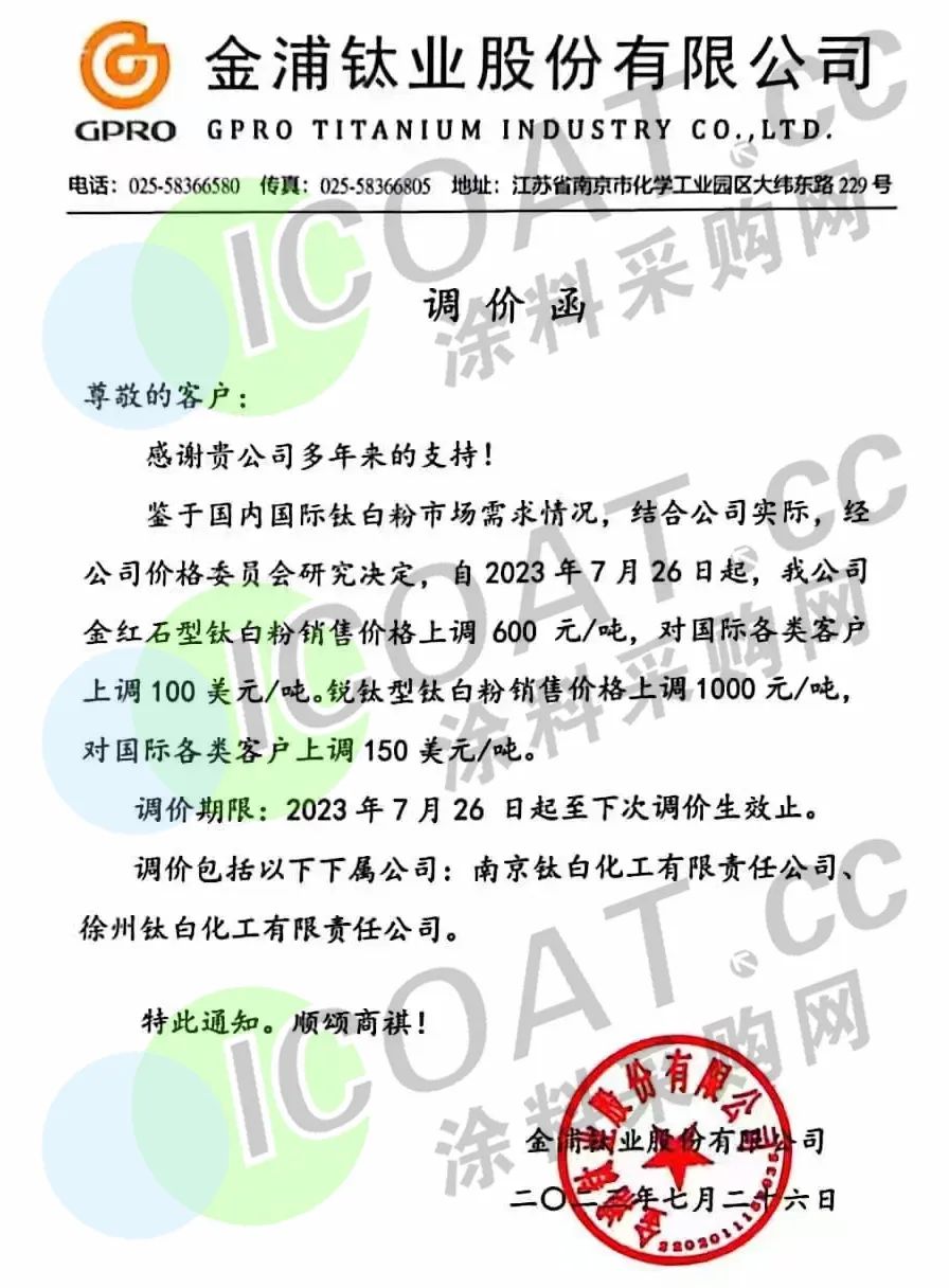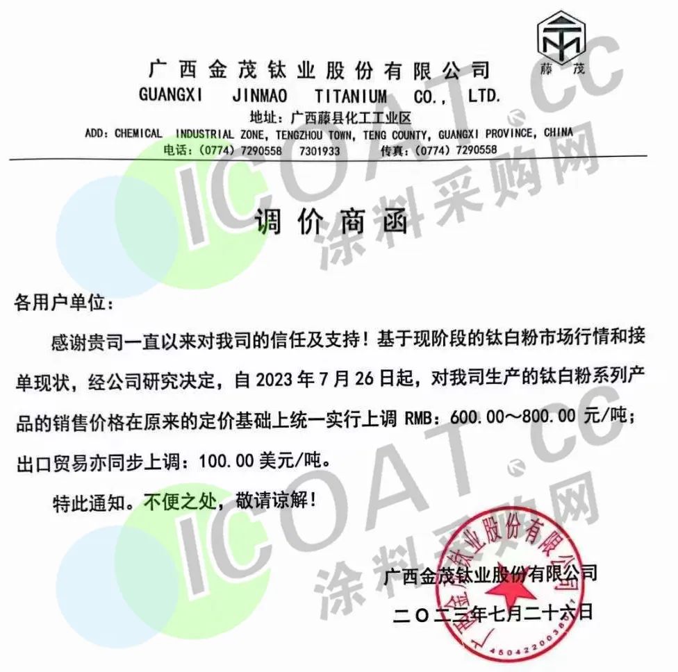 会议释放出的重要信号,迅速成为各行各业重点研究的课题,以便在下半年尽快调整企业的战略布局,扭转低迷行情。在化工行业,毫无例外的也出现了刺激性的反映。会议次日(25日),国内期市化工板块全线飘红,尿素主力上涨3.94%,纯碱主力上涨1.15%,甲醇主力上涨1.67%,聚丙烯主力上涨1.08%,苯乙烯主力上涨1.01%。对于市场不看好的原因和会议中提到的一致,都是国内需求不足。但即便如此,仍有不少化工品价格上升,此时的上涨行情就不再是来自下游市场的推动,而是“供给侧”的选择所致。龙佰集团发布调价函,国内各类客户上调600-800元/吨,对国际各类客户上调100美元/吨。中核钛白表示,7月26日起,各型号钛白粉销售价格在原价格基础上:国内各类客户上调700元/吨,国际各类客户上调100美元/吨。安纳达表示,7月26日起,金红石型钛白粉和锐钛型钛白粉国内销售基价均上调600元/吨,外贸销售基价上调100美元/吨。金浦钛业表示,自2023年7月26日起,金红石型钛白粉销售价格上调600元/吨,对国际各类客户上调100美元/吨;锐钛型钛白粉销售价格上调1000元/吨,对国际各类客户上调150美元/吨。攀枝花市海峰鑫化工表示,即日起金红石型系列钛白粉在现有价格基础上上调700元/吨。山东鲁北供应链管理有限公司表示,7月26日起,调整硫酸法钛白粉系列产品的市场价格,国内客户在原价基础上上调800元/吨。