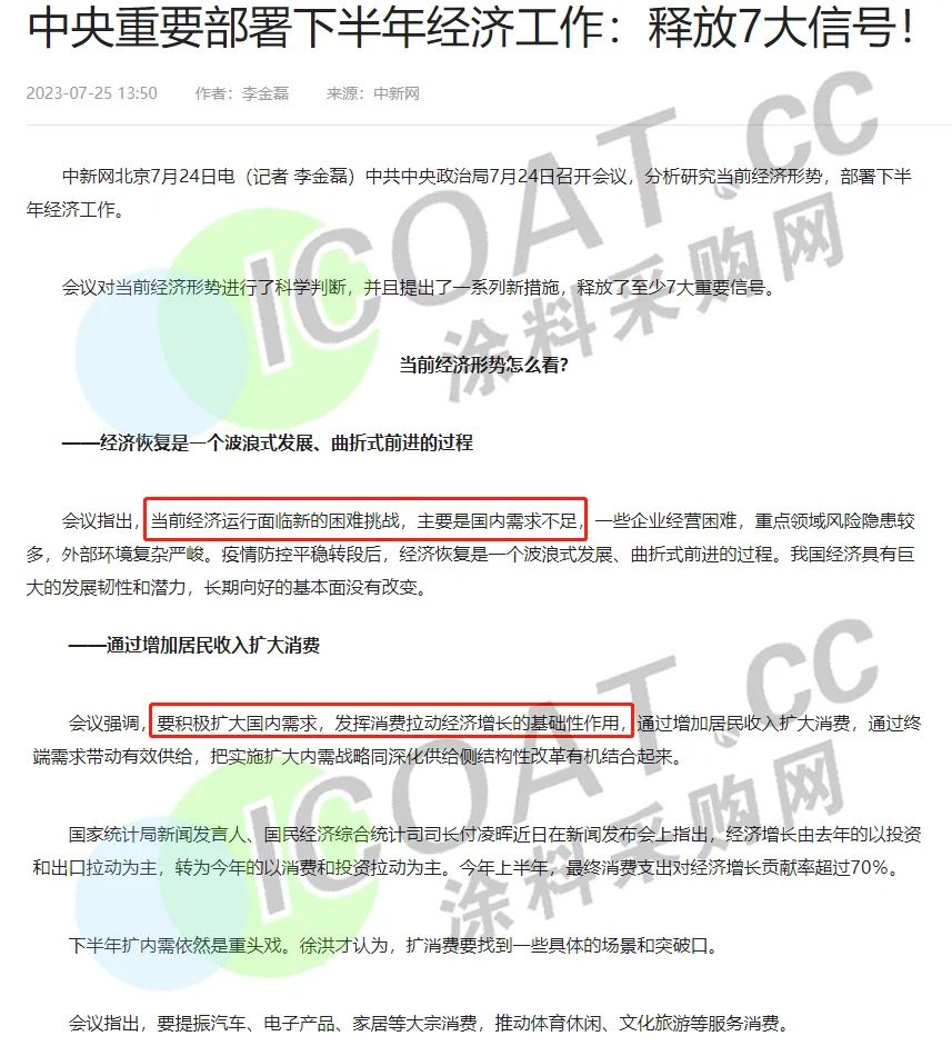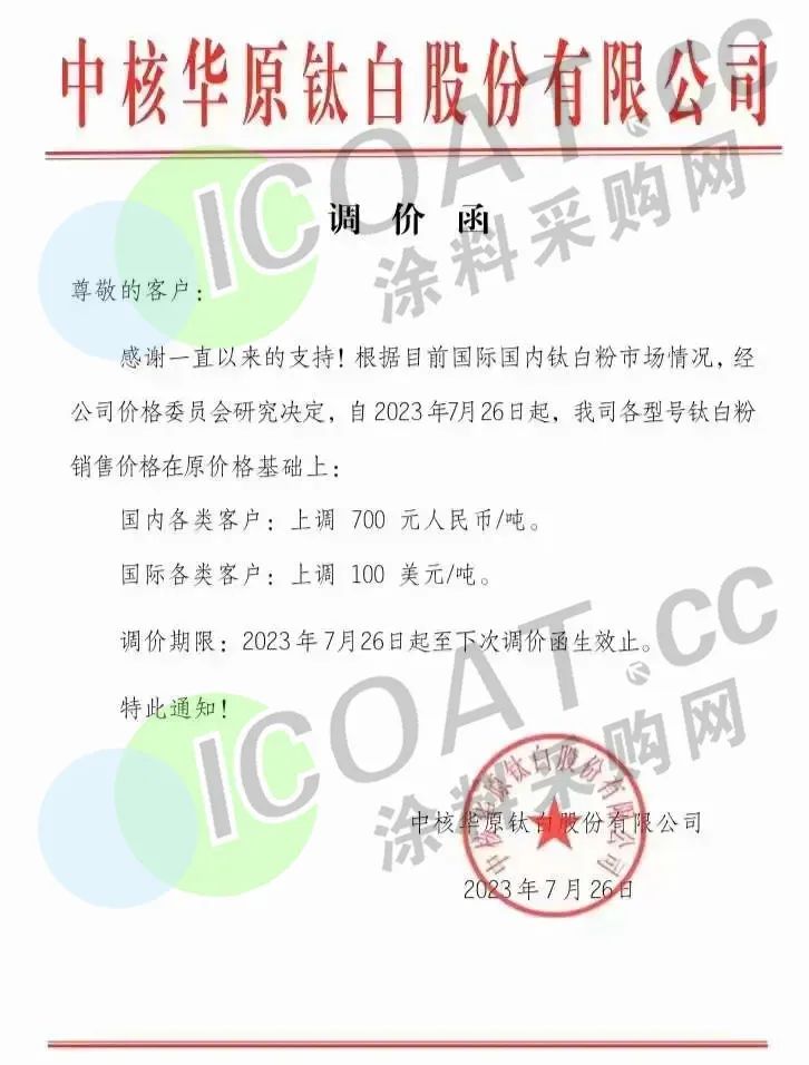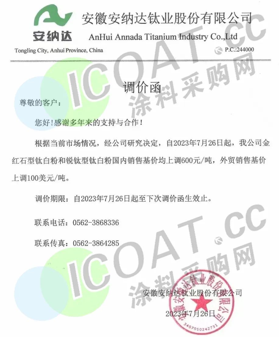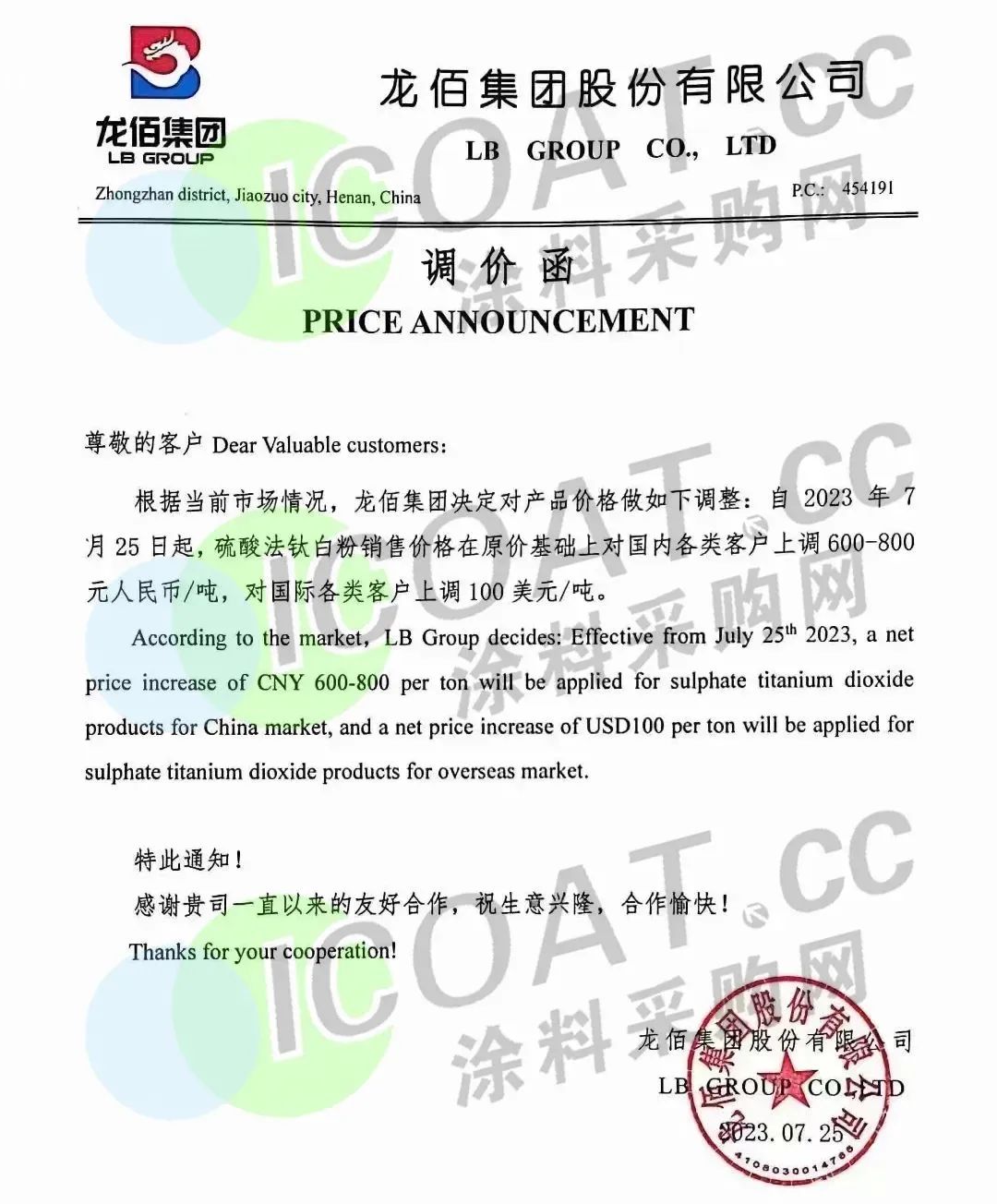 会议释放出的重要信号,迅速成为各行各业重点研究的课题,以便在下半年尽快调整企业的战略布局,扭转低迷行情。在化工行业,毫无例外的也出现了刺激性的反映。会议次日(25日),国内期市化工板块全线飘红,尿素主力上涨3.94%,纯碱主力上涨1.15%,甲醇主力上涨1.67%,聚丙烯主力上涨1.08%,苯乙烯主力上涨1.01%。对于市场不看好的原因和会议中提到的一致,都是国内需求不足。但即便如此,仍有不少化工品价格上升,此时的上涨行情就不再是来自下游市场的推动,而是“供给侧”的选择所致。龙佰集团发布调价函,国内各类客户上调600-800元/吨,对国际各类客户上调100美元/吨。中核钛白表示,7月26日起,各型号钛白粉销售价格在原价格基础上:国内各类客户上调700元/吨,国际各类客户上调100美元/吨。安纳达表示,7月26日起,金红石型钛白粉和锐钛型钛白粉国内销售基价均上调600元/吨,外贸销售基价上调100美元/吨。金浦钛业表示,自2023年7月26日起,金红石型钛白粉销售价格上调600元/吨,对国际各类客户上调100美元/吨;锐钛型钛白粉销售价格上调1000元/吨,对国际各类客户上调150美元/吨。攀枝花市海峰鑫化工表示,即日起金红石型系列钛白粉在现有价格基础上上调700元/吨。山东鲁北供应链管理有限公司表示,7月26日起,调整硫酸法钛白粉系列产品的市场价格,国内客户在原价基础上上调800元/吨。