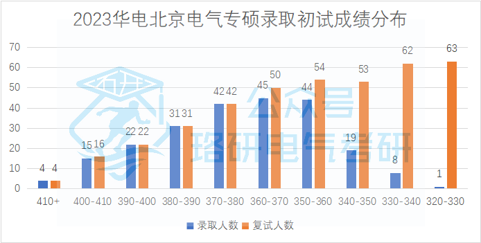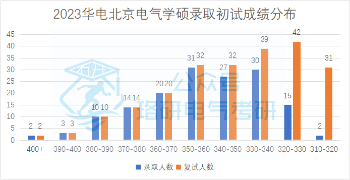 华电北京校区专硕招收231人,复试线为国家线。复试因为与非全统一划线,所以复试线是国家线,但实际能被录取的初试最低分为327分。初试1:1分数线为348分,录取平均分为371分。分数低于348的考生中最后有17人被录取,复试的逆袭概率仅有7.4%。复试被刷掉的初试最高分为400分,该同学没参加复试因此各科成绩均为0。录取考生的初试成绩分布情况如下: