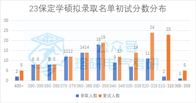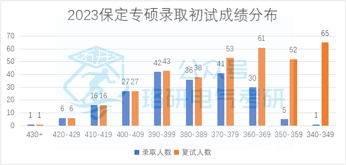 华电保定校区专硕招收205人,复试线为国家线。复试因为与非全统一划线,所以复试线是国家线,但实际能被录取的初试最低分为345分。初试1:1分数线为367分,录取平均分为387分。分数低于367的考生中最后有25人被录取,复试的逆袭概率为12%。录取考生的初试成绩分布情况如下: