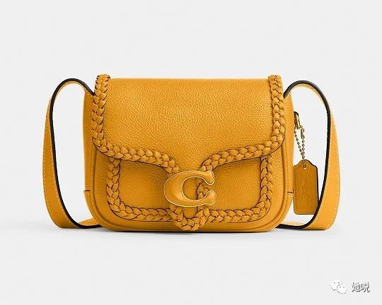 Tabby Messenger 19 信使包采用鹅卵石纹皮革制成,手工编织的皮革饰边装饰在包盖、前置口袋和背面边缘,让包包的轮廓更显立体,搭配同色系C字母包扣和吊牌细节,推出萨摩亚太阳黄、玫瑰紫和琥珀棕3种颜色选择。