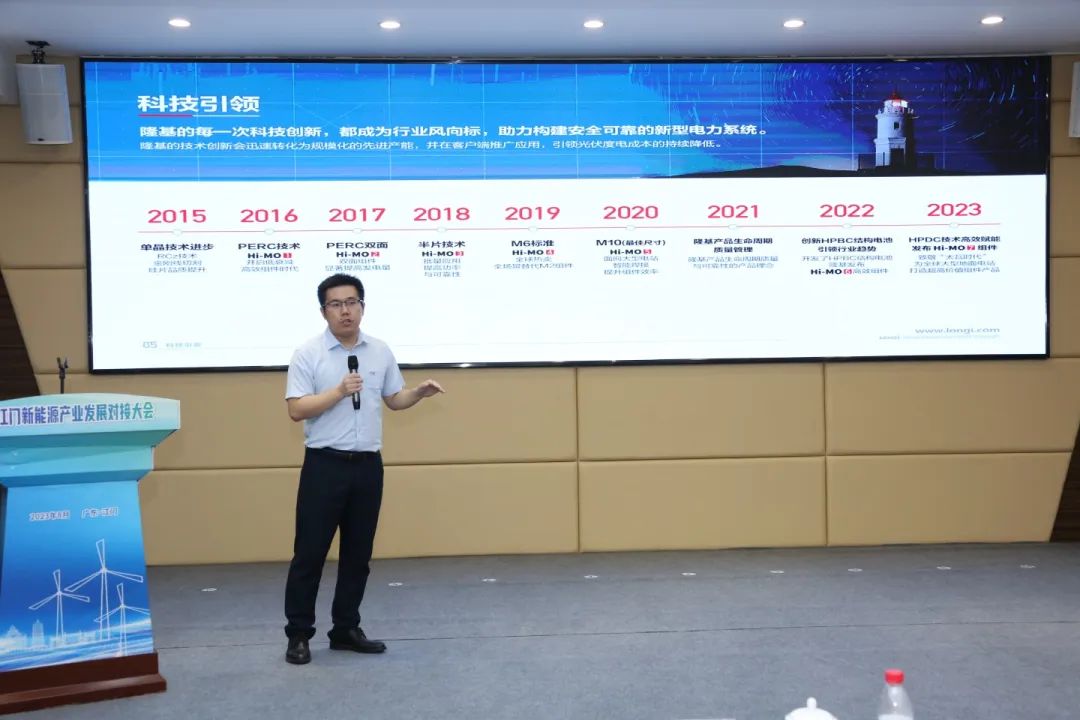 隆基绿能介绍了公司单晶硅片、电池组件、分布式光伏解决方案等五大业务板块,立足自身科技研发优势,并结合江门本土实际,探讨打造江门 “绿电”+“绿氢”零碳发展模式。