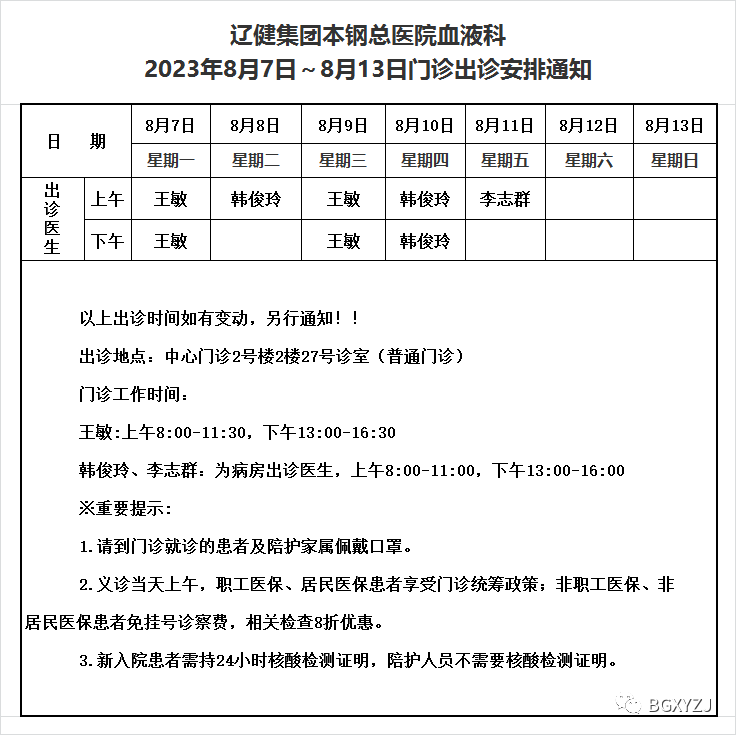 辽健集团本钢总医院血液科2023年8月7日~8月13日门诊出诊安排通知