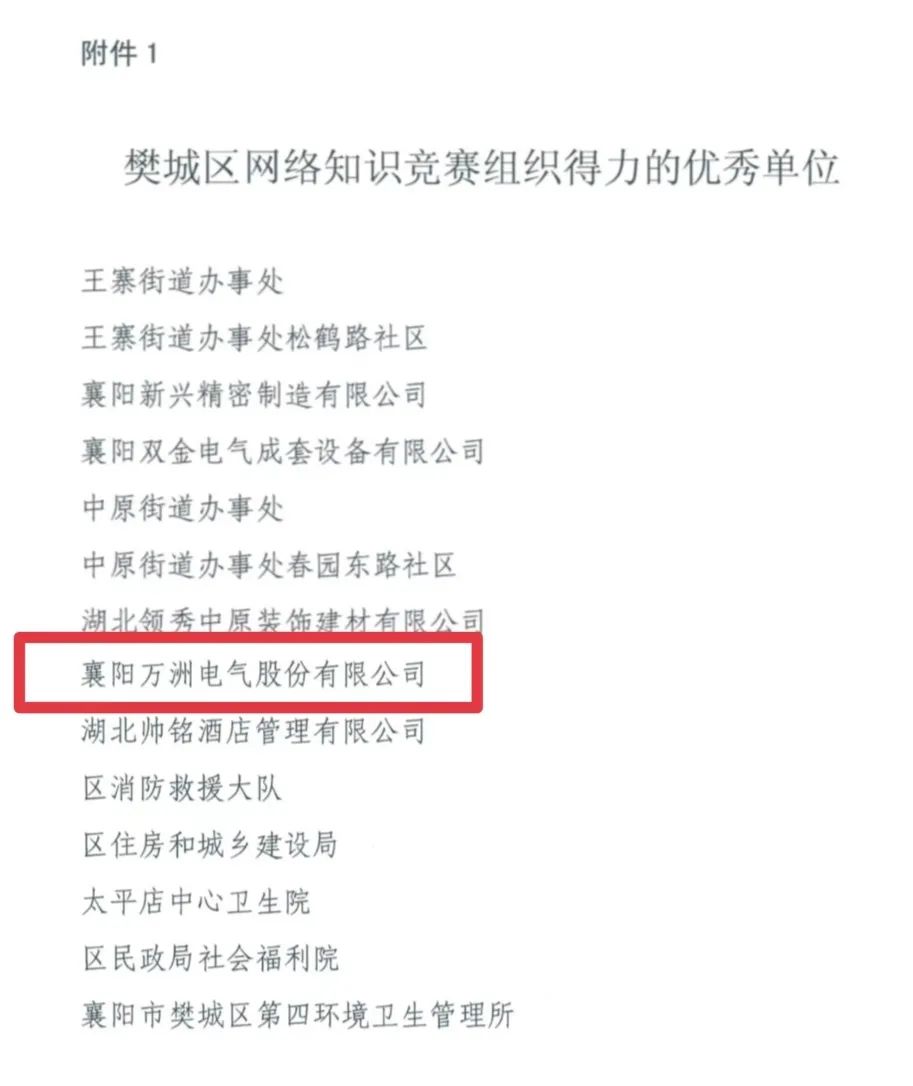 8月3日,从樊城区安全生产委员会获悉,万洲电气股份有限公司在全国安全生产网络知识竞赛中精心组织、积极参与、表现突出,被列为“樊城区安全网络知识竞赛组织得力的优秀单位”。