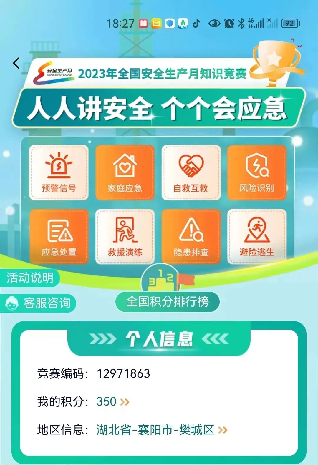 万洲电气紧紧围绕2023年安全生产月活动主题,组织发动各部门参加全国“人人讲安全、个个会应急”网络知识竞赛。公司制定知识竞赛奖励办法,鼓励员工踊跃参加,坚持答题,在公司营造了“人人增强安全意识、安全责任,个个学会查隐患、避险自救”的浓厚氛围,提高了员工应急处置能力,筑牢公司安全生产防线。