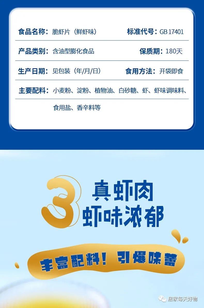 这款脆虾片的保质期达到了180天,让您可以尽情享受美味的同时,也不用担心变质的问题。您可以随时开袋即食,方便快捷。