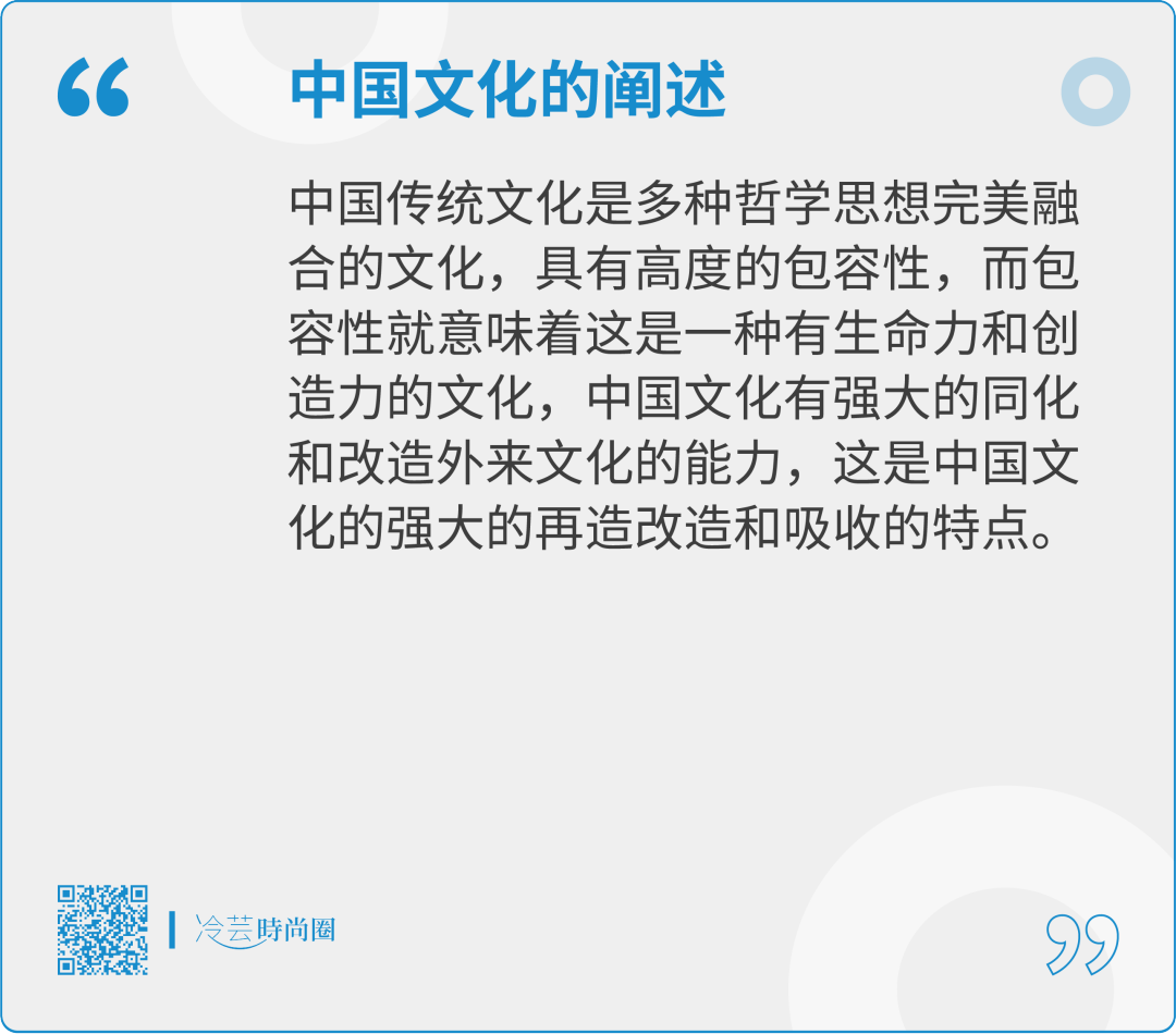 中国传统文化是多种哲学思想完美融合的文化,具有高度的包容性,而包容性就意味着这是一种有生命力和创造力的文化,中国文化有强大的同化和改造外来文化的能力,这是中国文化的强大的再造改造和吸收的特点。