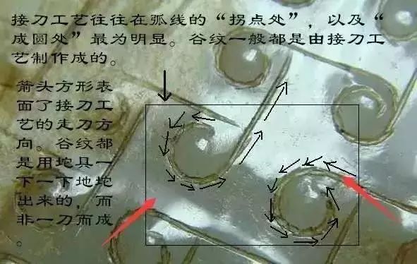 所谓接刀工艺简单概括就是:古玉表面的长阴刻线都是由一段段短阴刻线连接而成,若断若续,这是由坨具旋转轻起轻落形成的,一般称之为“接刀工艺”或者“跳刀工艺”。