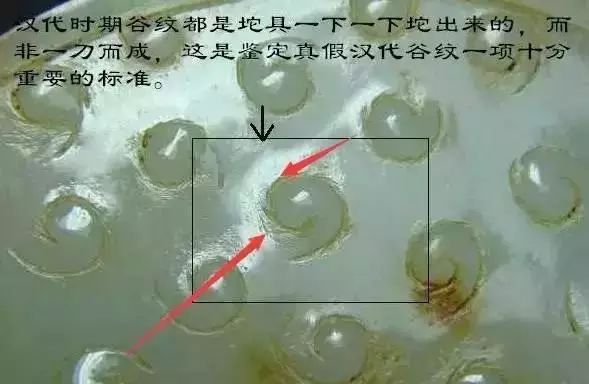 而仿品古玉的阴刻线底部一般认为像字母“U"的最底端一样是弧形的,或者是平的,这种弧形或平的底部是由电动铊决定的。
