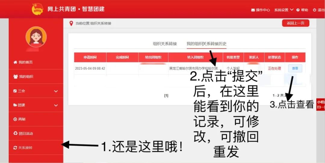 * 如果转出团支部为了“省事儿”将所有团员都发起转接,遇到这种情况,团员不要点击,与转出团支部进行确认即可。