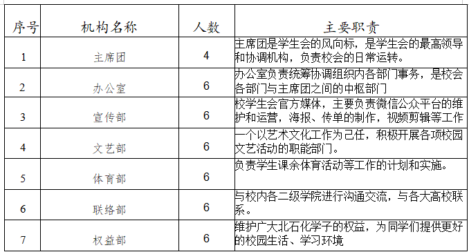 (三)班委会一般由班长、副班长、学习委员、生活委员、文艺委员、体育委员、心理委员组成,协助学校、学院解决同学生活、学习、工作中遇到的实际问题,维护同学的正当利益。