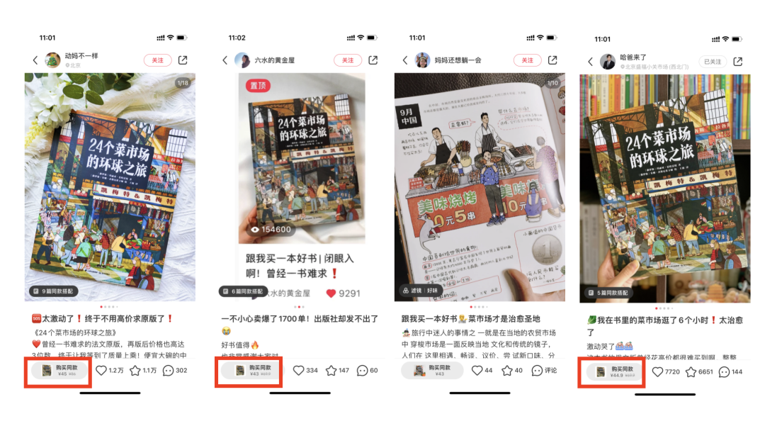 再看单个绘本书品牌,如24个菜市场的环球之旅,出版社找博主进行分销,但我们发现爆文和最新的笔记,图书的价格还不一样。新的启示是:如果产品在小红书做分佣,一定要控制好价格。这样博主作为经销商,才能更长久做,否则佣金不同,动力也不强。