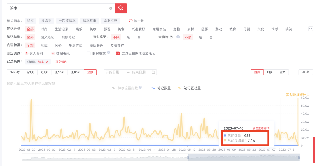 看完了品类现状后,再去看整个站内笔记情况,可通过第三方工具和APP。用第三方工具灰豚,搜索“绘本”,每天有600-700篇笔记发布,以7月16日看,当天发布633篇,平均互动超100+。试想,如果你在做小红书,你的笔记如何在633篇笔记中脱颖而出?