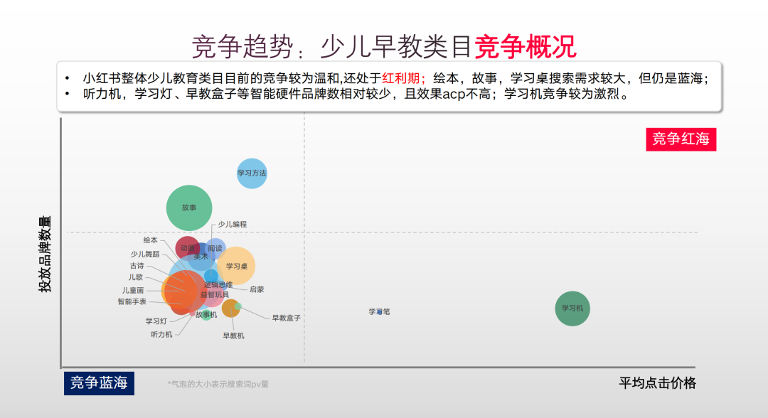 绘本属于蓝海市场,单次点击成本低,用户投放品牌少,从图中可以看到,学习机点击成本高,侧面反映学习机竞争激烈。