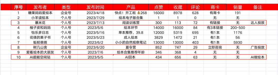 前10名内容分析,博主推的都是单个绘本,以故事、颜值、系列来推。如果你正在推绘本,一定要整理卖点和需求表,然后1对1BD博主,寄送产品,然后做分佣。