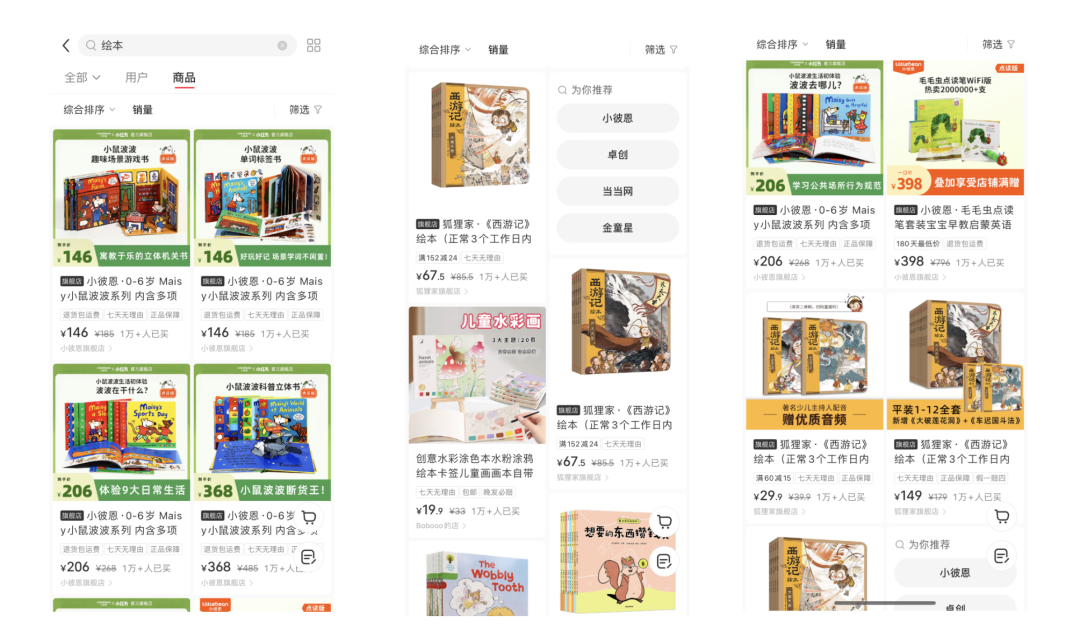 具体绘本在小红书卖的如何?搜索“绘本”,按照销量排序,前10名,有8名是小彼恩、2名是狐狸家,月销都超过1W+。