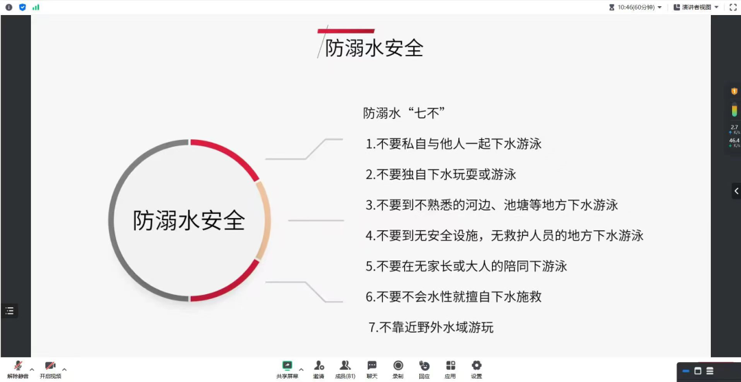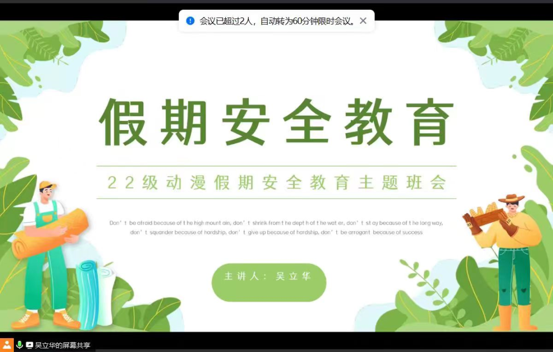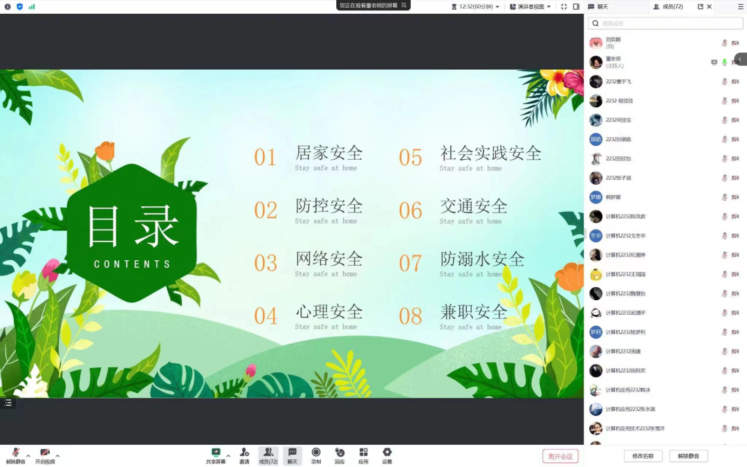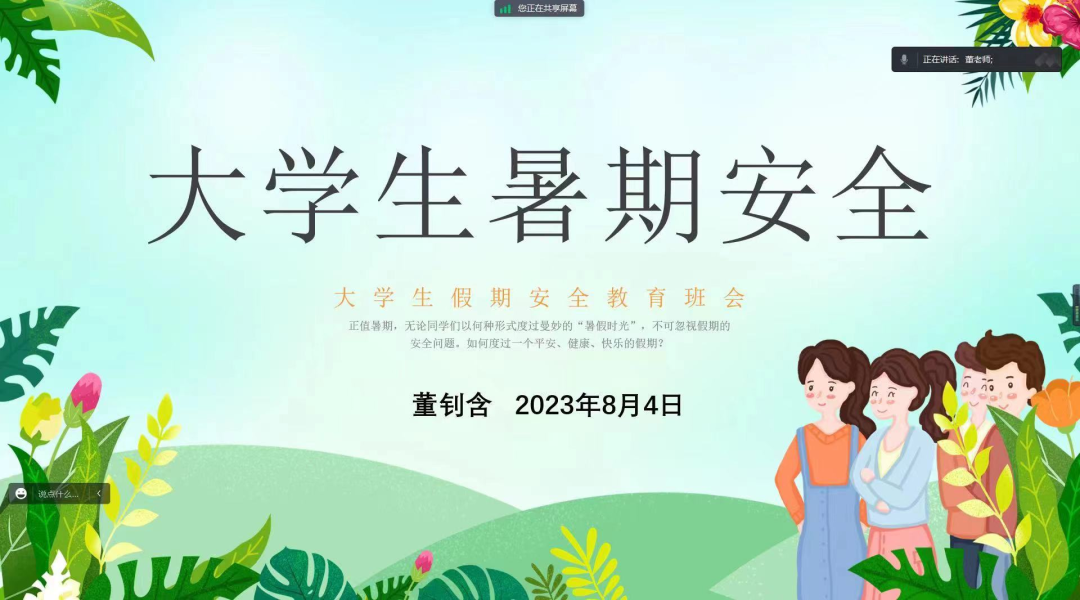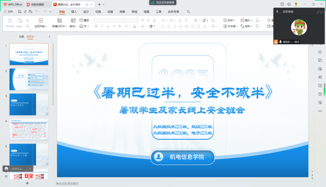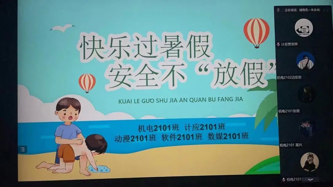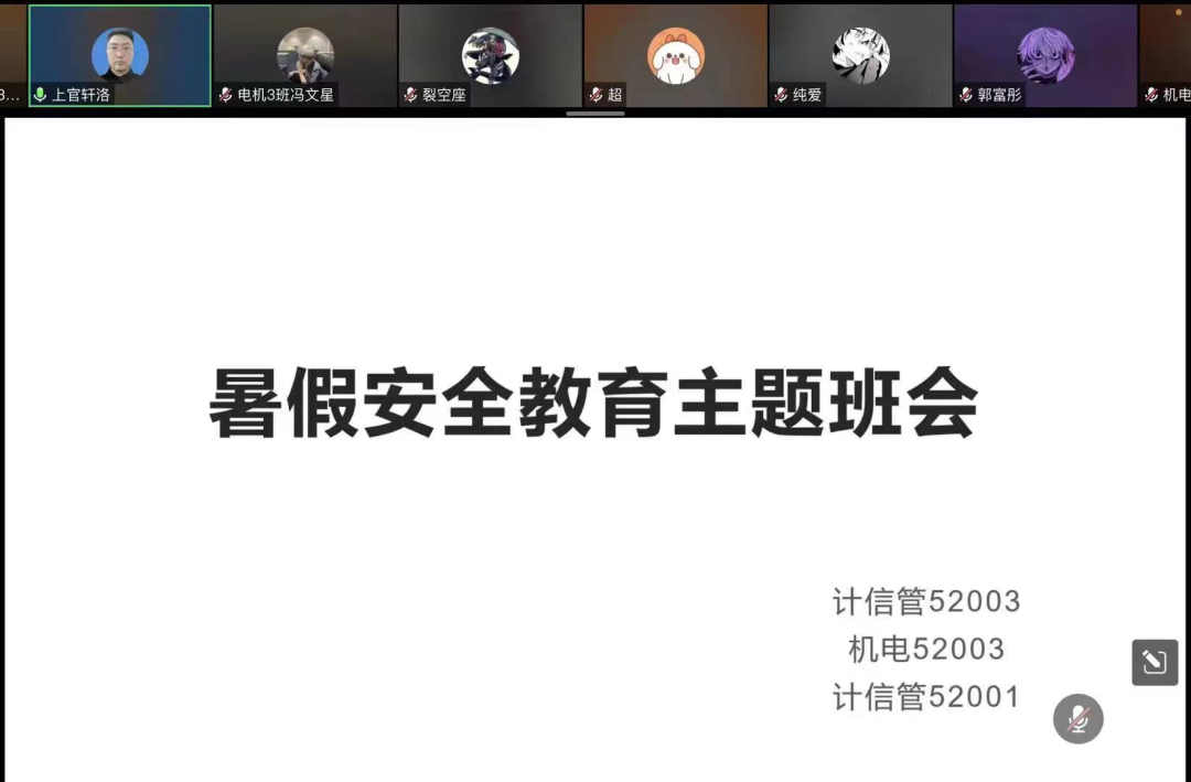 为切实做好暑假期间学生安全管理工作,帮助学生强化安全防范意识、提高安全防范能力、提升自护自救能力,确保同学们度过一个健康、安全、愉快和有意义的暑假,根据学校相关工作安排,2023年8月4日——5日机电信息学院35个班级组织开展了暑假学生及家长线上安全教育主题班会,力求全方位做好假期安全教育工作。