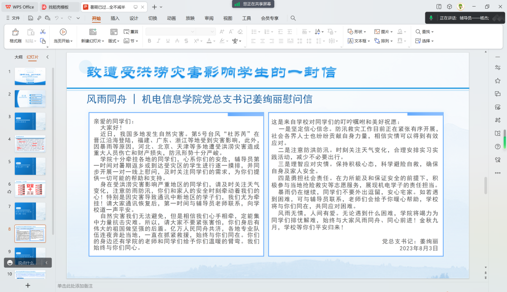 最后,学习党总支书记姜绚丽致遭受洪涝灾害影响学生的一封信,传达姜书记对身处灾区的同学及广大家长朋友们的慰问。同时号召广大团员青年立即行动起来,积极投身到防汛救灾工作当中,充分发挥团员青年的生力军和突击队作用,服务于各地防汛救灾工作大局,为夺取防汛救灾工作的全面胜利做出积极贡献。