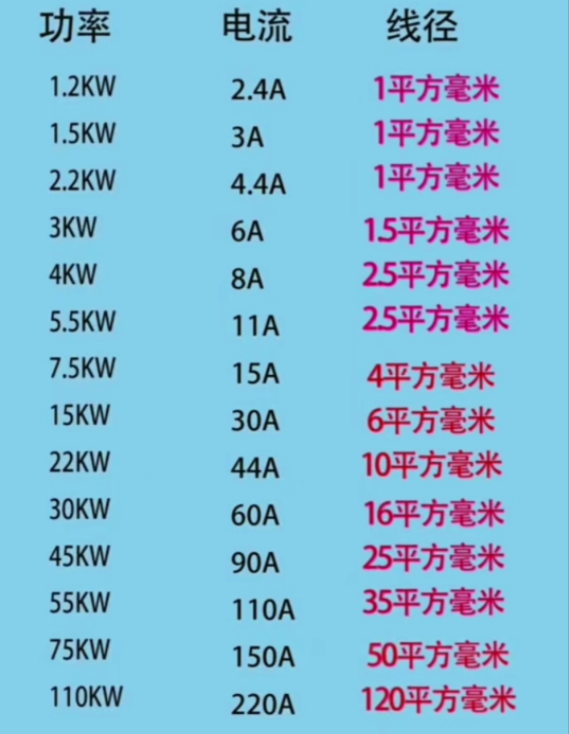 电工“武功秘籍”,一张图搞定三相电的电流功率和线径之间的关系