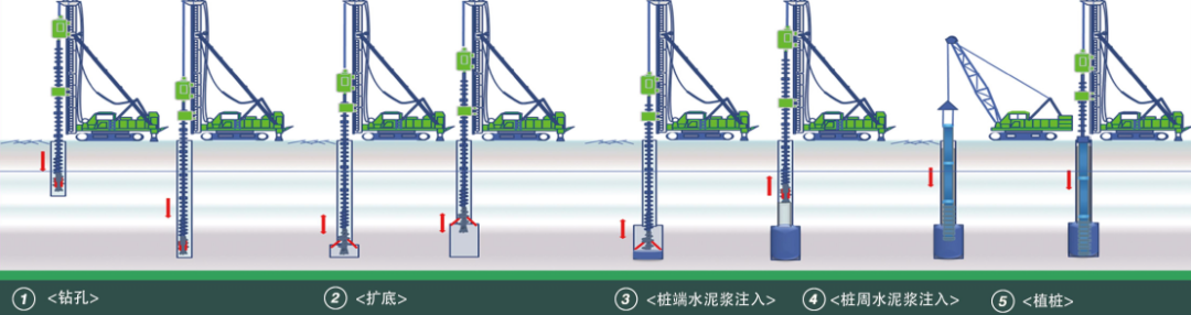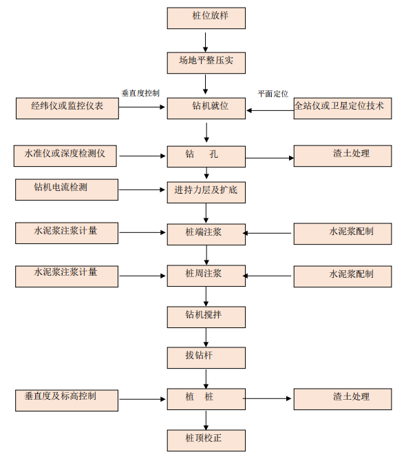 采用搅拌钻杆与螺旋钻杆干作业成孔的成孔工艺,按照设计深度进行钻孔,桩端部按照设计尺寸(直径与高度)进行扩孔,扩孔完成后,注入桩端水泥浆和桩周水泥浆,边注浆边提钻,钻孔完成后依靠桩的自重将桩植入设计标高,通过桩端及桩周水泥浆液固化,使桩与桩端及桩周水泥浆固化土体形成一体,共同进行承载受力。