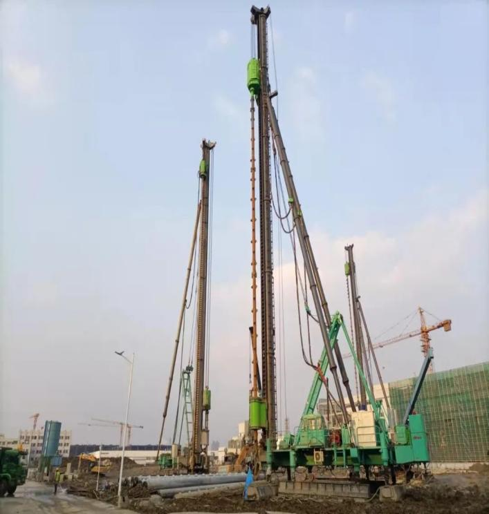静钻根植工法设备主要为工法钻机搭配桩架,最初搭配单轨桩架施工,需要多次加接钻杆,施工效率较低,现在多搭配双轨桩架,同时悬挂两台工法钻机,交替接钻杆一次,深度可达85m,极大的提高了施工效率。
