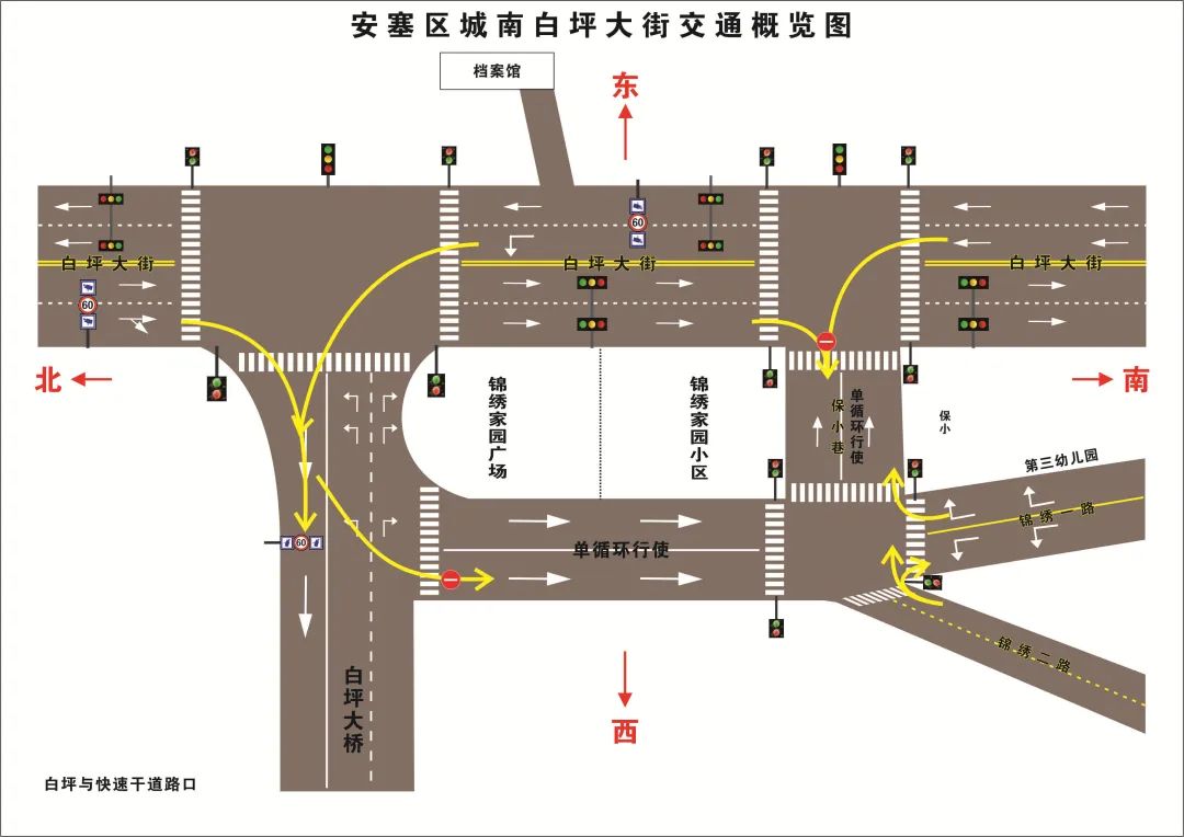 1、由安塞五里湾方向驶往白坪大街的机动车或非机动车,禁止驶入通往锦绣一路、二路的白坪大桥至保小西十字路段;