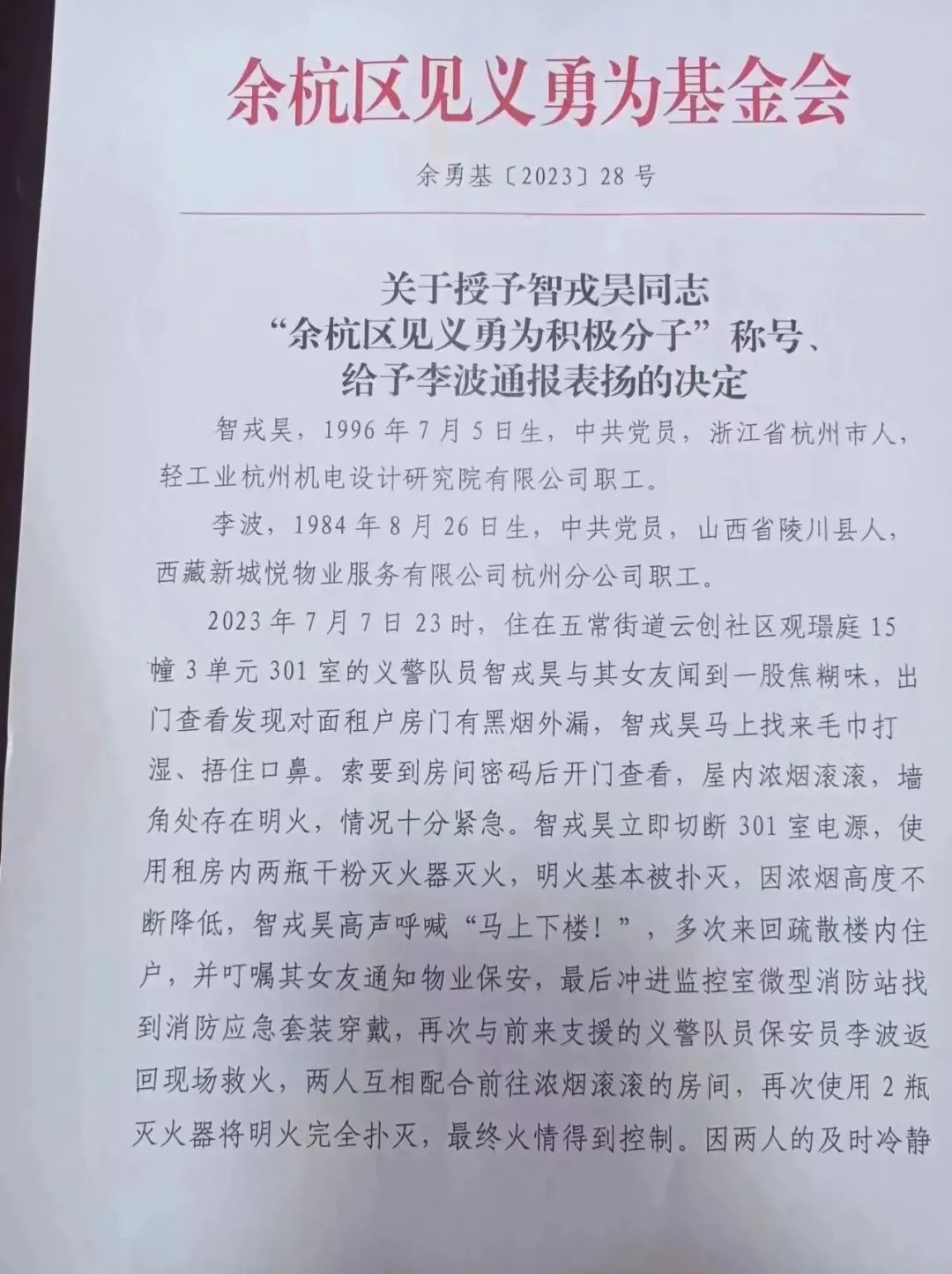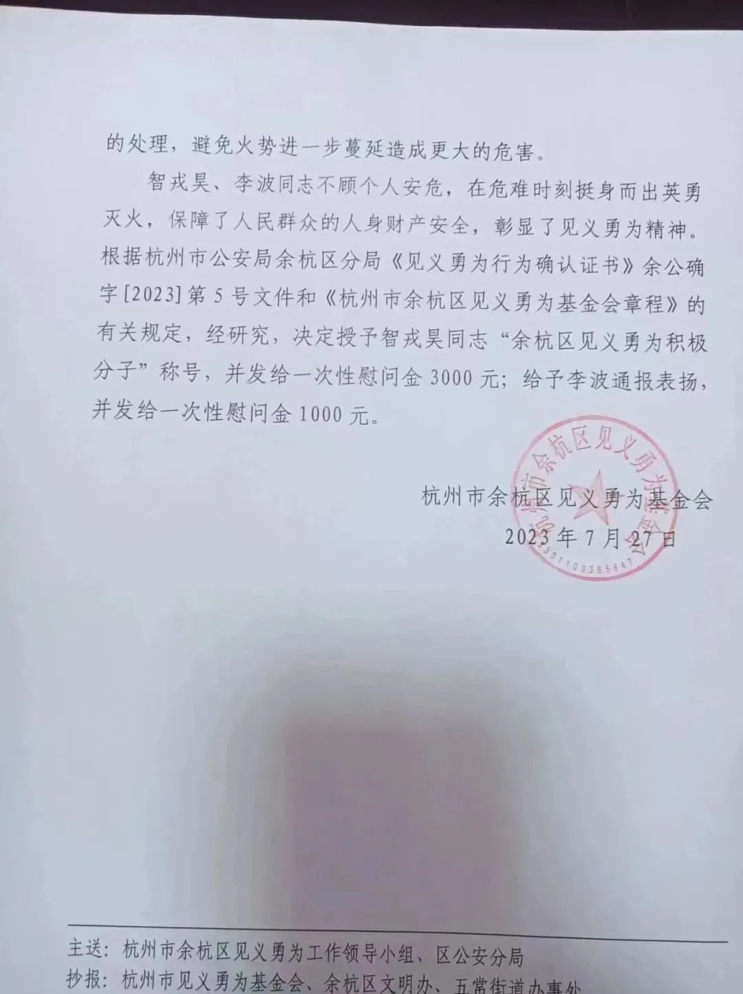 根据杭州市公安局余杭区分局《见义勇为行为确认证书》余公确字 [2023]第 5 号文件和《杭州市余杭区见义勇为基金会章程》的有关规定,经研究,给予李波通报表扬并发给一次性慰问金 1000 元。