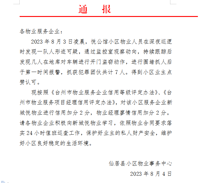 2023年8月3日凌晨,新城悦物业服务在管项目悦公馆小区物业人员在深夜巡逻时发现一队人形迹可疑,通过监控室观察动向,持续跟踪后发现几人在地库对车辆进行开门盗窃动作,进行围堵抓人后于第一时间报警,抓获犯罪团伙共计 7人。得到小区业主点赞认可。