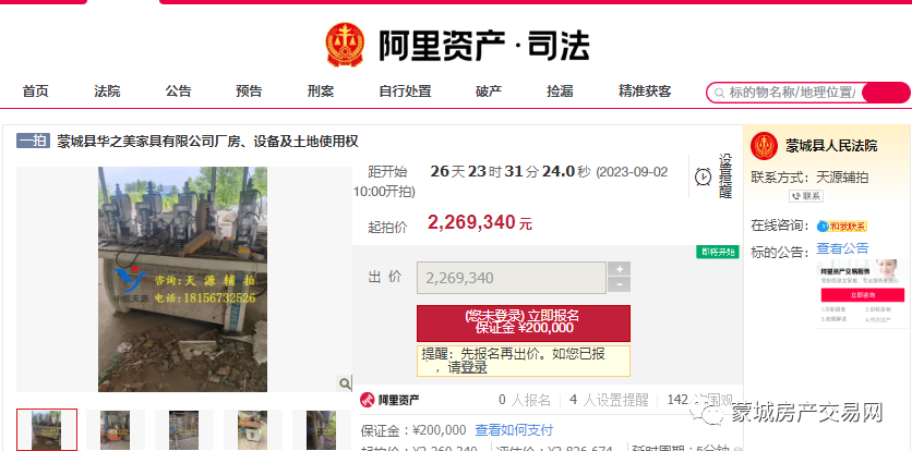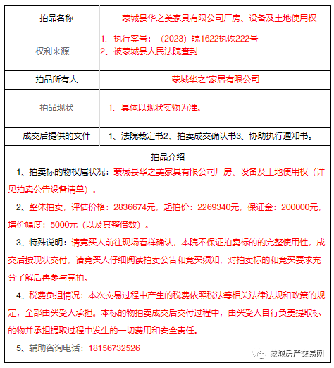 一、本次拍卖标的物:蒙城县华之美家具有限公司厂房、设备及土地使用权(不动产权证号:皖(2019)蒙城县不动产权第0008817号);土地面积:7894.40㎡;用途:工业用地;权利性质:出让。