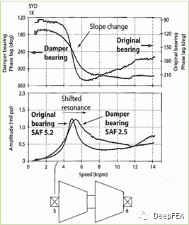 操作人员还怀疑不稳定性是由转子系统的阻尼不足引起的。为了验证这个推测,他们将5号轴承更换为含特殊挤压油膜阻尼器的油膜轴承,即设计两层同心油膜,以提供额外阻尼。