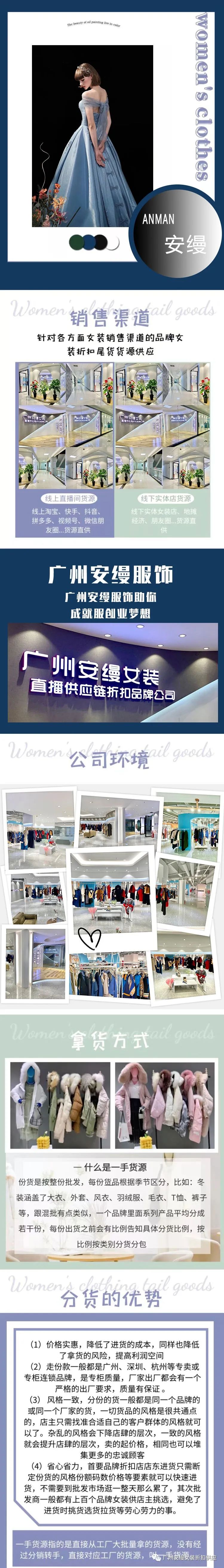 安缦品牌折扣女装服饰有限公司是一家从事品牌女装批发的公司,主营:品牌折扣店货源、品牌折扣批发、尾货女装批发等。公司看货展厅有5000平方,仓库3000平方,长年保持600个品牌供应,品牌更新快,价格低。批发品牌汇聚内外一二线各知名品牌。每季度更新品牌500--1000个。