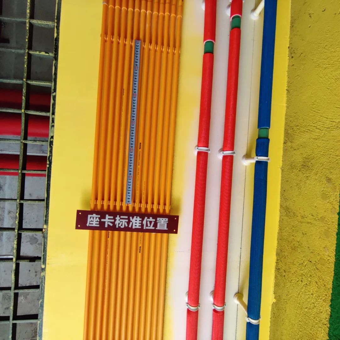 ④、线卡固定间距:多管并排,线卡位置必须在控制箱上、下、左、右、顶、地转角的前、后、左、右150-200mm处固定,不得大于200mm,双管、单管离墙、顶、地、及线盒的上、下、左、右的线卡固定均为100-150mm,不得大于150mm,多管直线线卡间距为500mm,双管、单管直线不得大于400m,根据现场由线盒周边第一个线卡和地、顶周边第一列线卡往上,平均分配为最佳。
