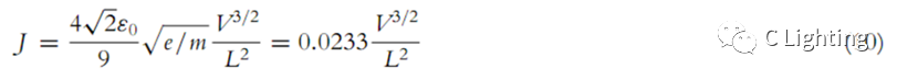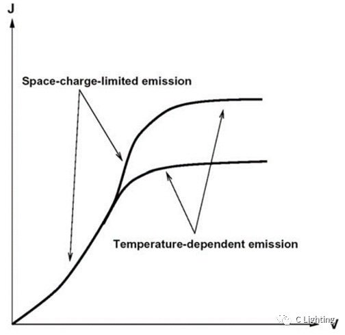 在实际的电子枪设计中,电子枪的电流通常小于饱和电流。在这种情况下,电场的强度不足以从阴极吸走所有可用的自由电子。因此,残余电子聚集在阴极表面附近,形成电子云层。这种工作方式被称为空间电荷限制发射,其优点是在阴极稍前方形成一个较小的虚拟阴极,该虚拟阴极具有稳定的电荷密度,基本上与阴极温度无关。平行电极之间的电流由Child定律给出,其中,V是加速电压,L是阴极和阳极之间的距离: