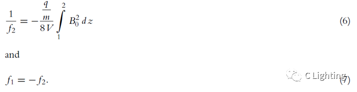 其中V0是轴上的电势。例如,由于导数V'0和V"0相对于V0进行归一化,因此可以理解为决定电子轨迹的是场分布而不是电势强度。这表明所有平行于轴线的轨迹,无论其初始半径如何,都具有相同的焦点。需要注意的是,射线方程中不包含电子电荷q和电子质量m。这意味着该方程也适用于其他粒子,如离子。利用图2中的射线示意图,可以从公式(2)中得到薄(thin)电子透镜的两个焦距为: