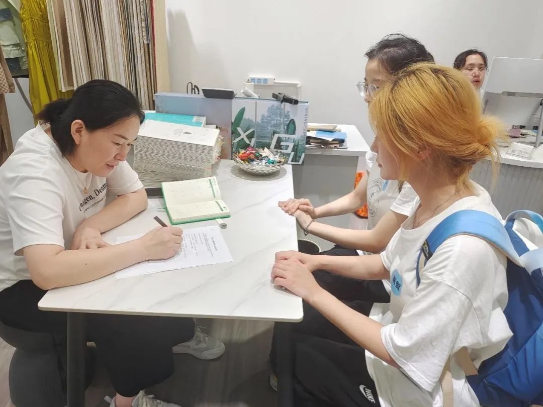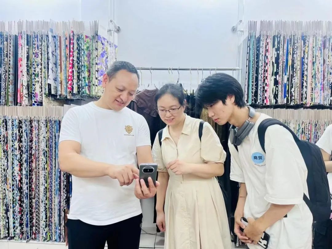 暑期社会实践的第四站是轻纺城周边的纺织服装企业。通过与绍兴帛米纺织有限公司、绍兴纤谷纺织品有限公司等企业的面对面交流,进一步了解到商户在传统纺织贸易市场发展壮大后,进入写字楼,致力于做大做强。帛米纺织积极探索海外市场和线上市场,拓宽营销渠道。纤谷纺织逐步延伸产业链,聘请知名院校的面料研发团队合作开发并生产面料,打造“数字大脑”以提高生产效率及周转效率,深化与上下游企业联动,构造高效能数字供应链。同学们还重点学习了面料的分辨方法。