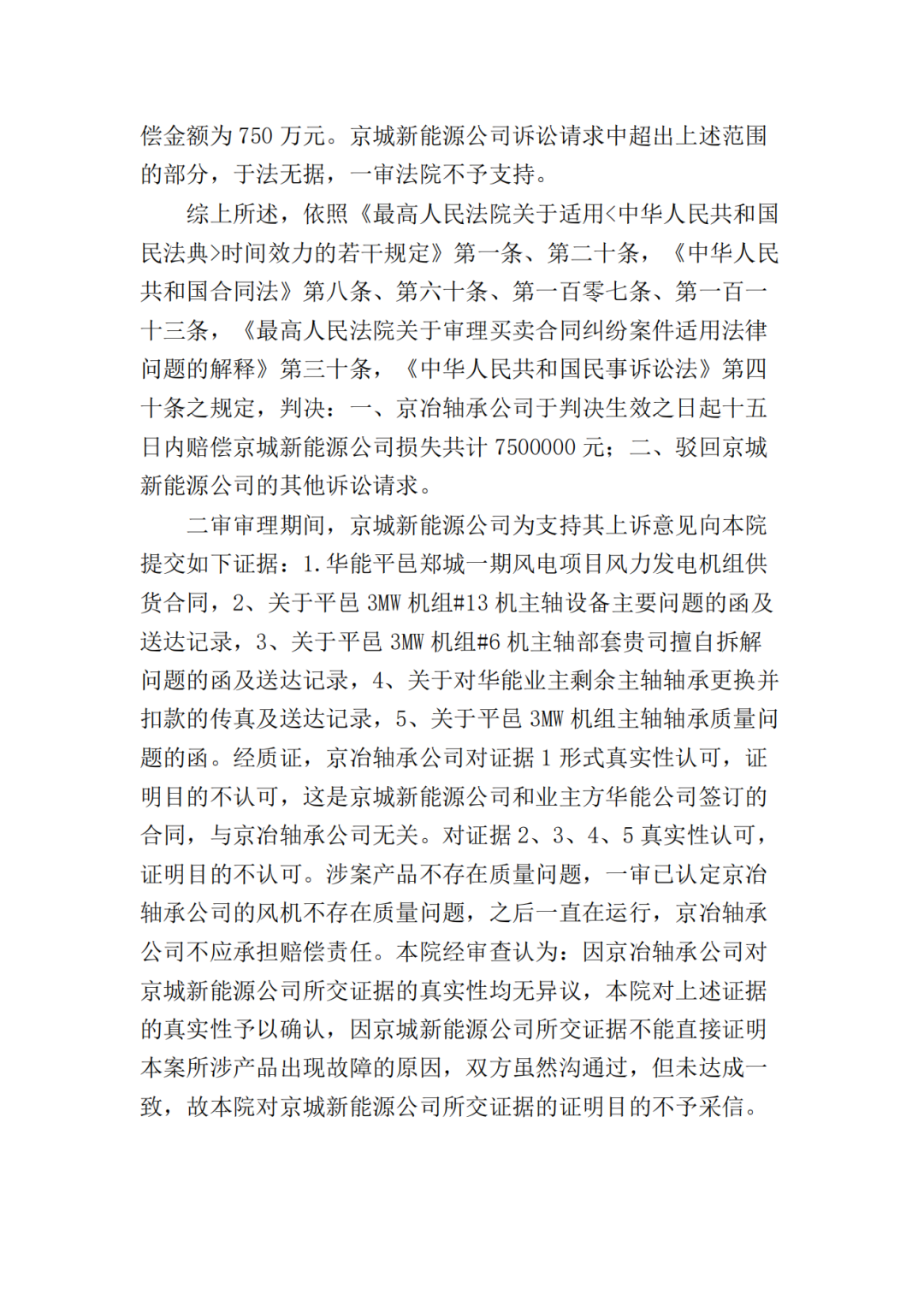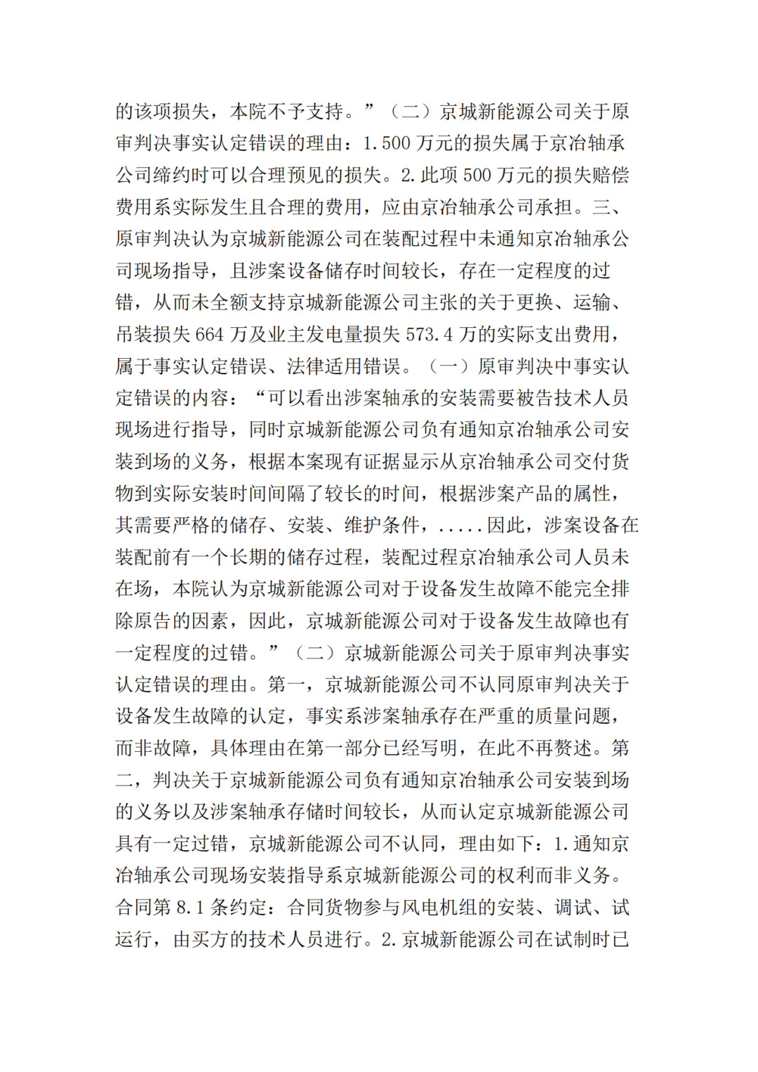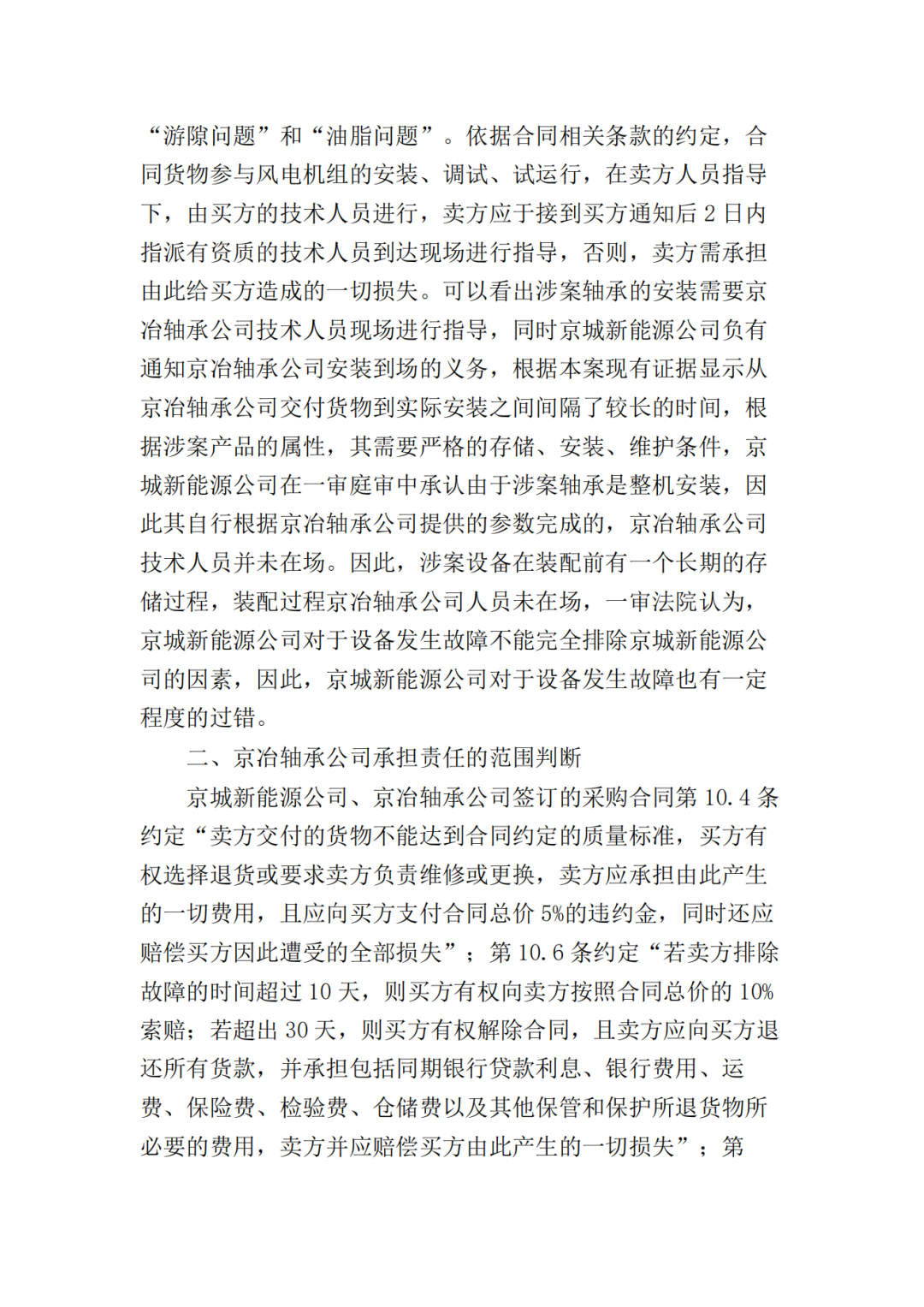 二、北京京冶轴承股份有限公司于本判决生效之日起十日内赔偿北京京城新能源有限公司损失共计17374000元;