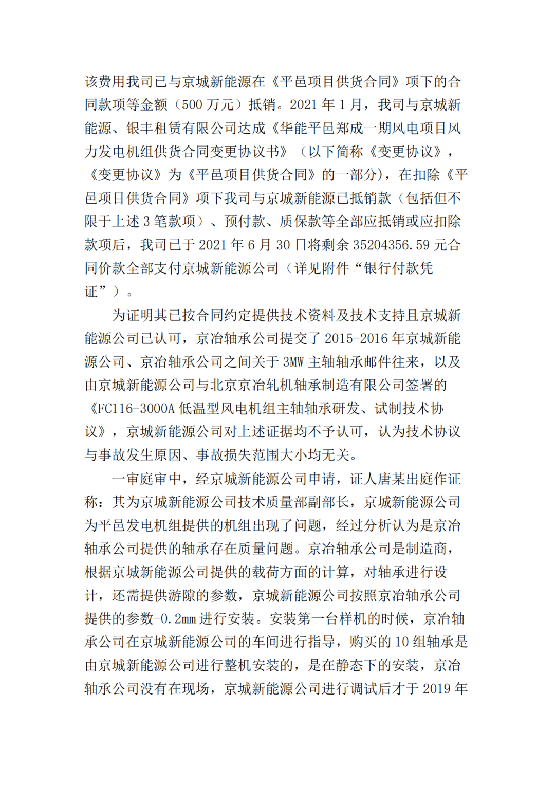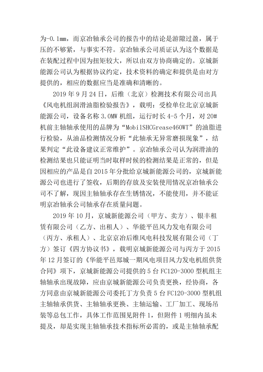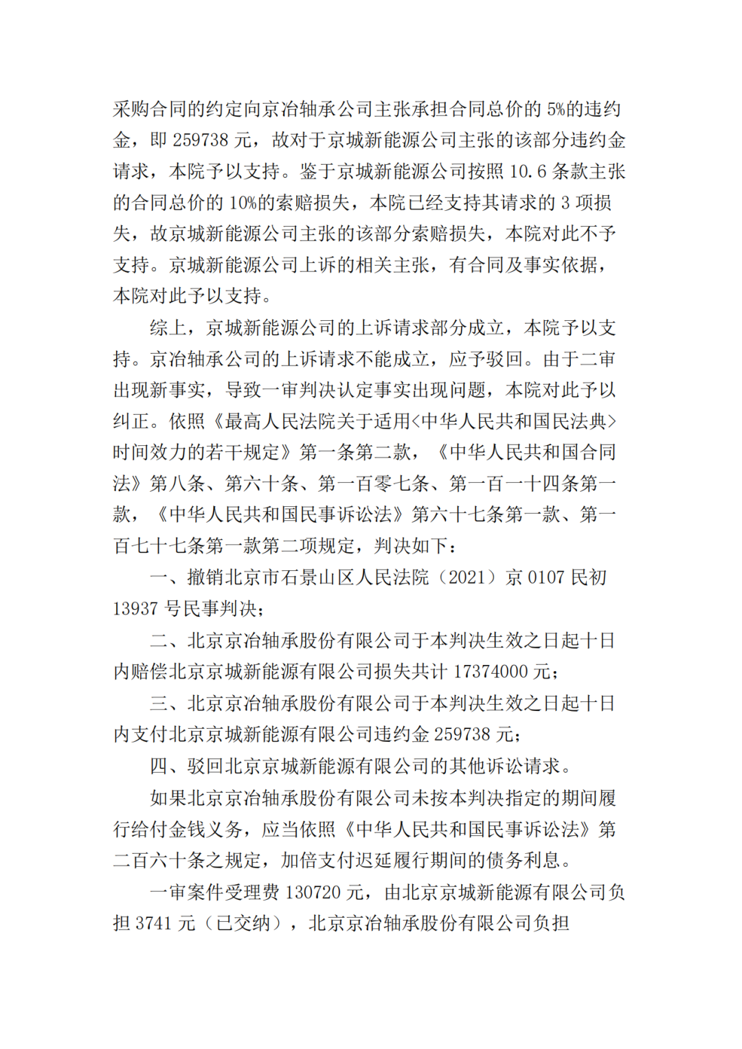 三、北京京冶轴承股份有限公司于本判决生效之日起十日内支付北京京城新能源有限公司违约金259738元;四、驳回北京京城新能源有限公司的其他诉讼请求。