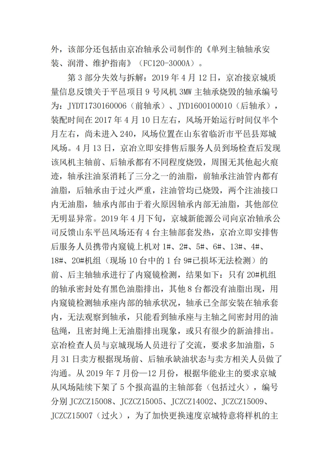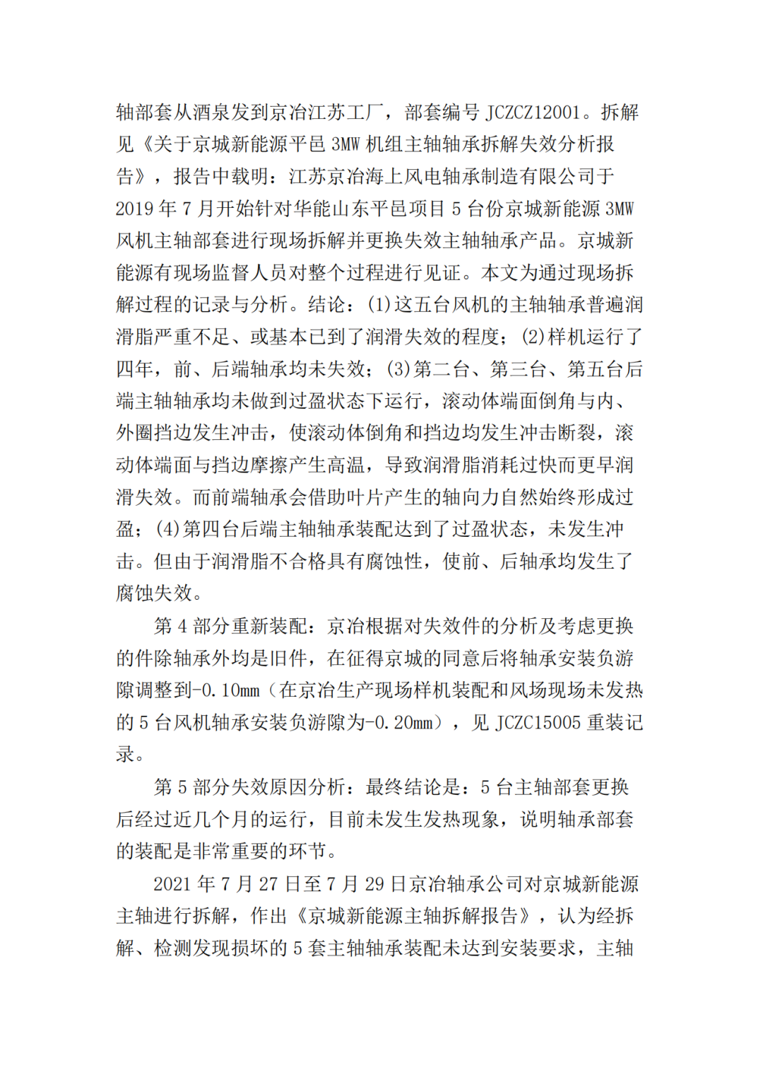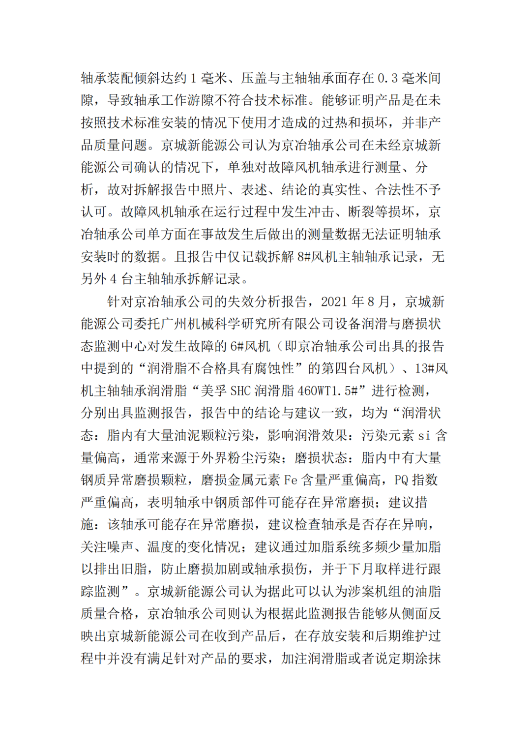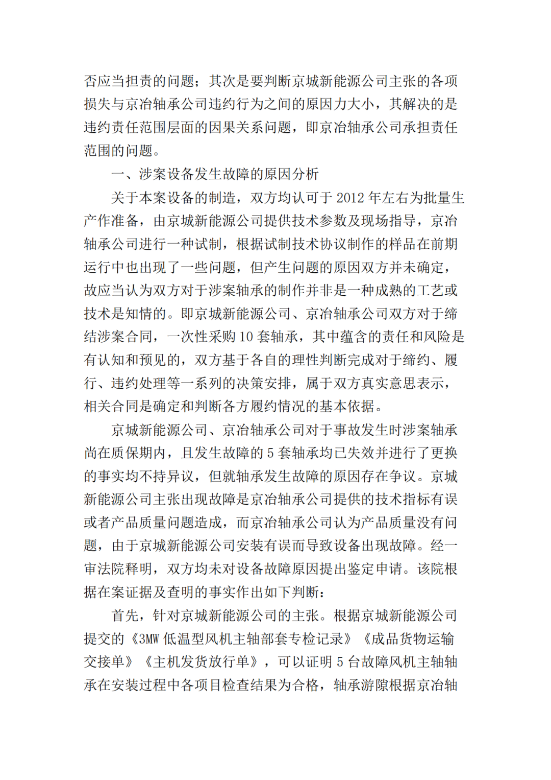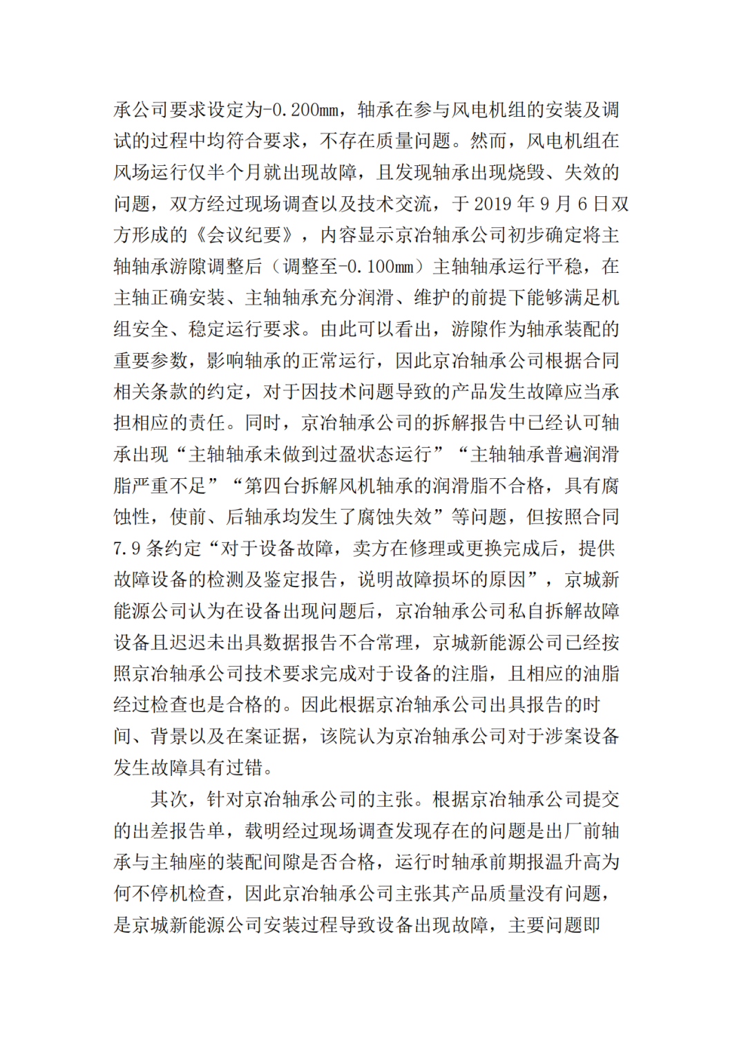 关于本案设备的制造,双方均认可于2012年左右为批量生产作准备,由京城新能源公司提供技术参数及现场指导,京冶轴承公司进行一种试制,根据试制技术协议制作的样品在前期运行中也出现了一些问题,但产生问题的原因双方并未确定,故应当认为双方对于涉案轴承的制作并非是一种成熟的工艺或技术是知情的。即京城新能源公司、京冶轴承公司双方对于缔结涉案合同,一次性采购10套轴承,其中蕴含的责任和风险是有认知和预见的,双方基于各自的理性判断完成对于缔约、履行、违约处理等一系列的决策安排,属于双方真实意思表示,相关合同是确定和判断各方履约情况的基本依据。京城新能源公司、京冶轴承公司对于事故发生时涉案轴承尚在质保期内,且发生故障的5套轴承均已失效并进行了更换的事实均不持异议,但就轴承发生故障的原因存在争议。京城新能源公司主张出现故障是京冶轴承公司提供的技术指标有误或者产品质量问题造成,而京冶轴承公司认为产品质量没有问题,由于京城新能源公司安装有误而导致设备出现故障。经一审法院释明,双方均未对设备故障原因提出鉴定申请。该院根据在案证据及查明的事实作出如下判断:首先,针对京城新能源公司的主张。根据京城新能源公司提交的《3MW低温型风机主轴部套专检记录》《成品货物运输交接单》《主机发货放行单》,可以证明5台故障风机主轴轴承在安装过程中各项目检查结果为合格,轴承游隙根据京冶轴承公司要求设定为-0.200mm,轴承在参与风电机组的安装及调试的过程中均符合要求,不存在质量问题。然而,风电机组在风场运行仅半个月就出现故障,且发现轴承出现烧毁、失效的问题,双方经过现场调查以及技术交流,于2019年9月6日双方形成的《会议纪要》,内容显示京冶轴承公司初步确定将主轴轴承游隙调整后(调整至-0.100mm)主轴轴承运行平稳,在主轴正确安装、主轴轴承充分润滑、维护的前提下能够满足机组安全、稳定运行要求。由此可以看出,游隙作为轴承装配的重要参数,影响轴承的正常运行,因此京冶轴承公司根据合同相关条款的约定,对于因技术问题导致的产品发生故障应当承担相应的责任。同时,京冶轴承公司的拆解报告中已经认可轴承出现“主轴轴承未做到过盈状态运行”“主轴轴承普遍润滑脂严重不足”“第四台拆解风机轴承的润滑脂不合格,具有腐蚀性,使前、后轴承均发生了腐蚀失效”等问题,但按照合同7.9条约定“对于设备故障,卖方在修理或更换完成后,提供故障设备的检测及鉴定报告,说明故障损坏的原因”,京城新能源公司认为在设备出现问题后,京冶轴承公司私自拆解故障设备且迟迟未出具数据报告不合常理,京城新能源公司已经按照京冶轴承公司技术要求完成对于设备的注脂,且相应的油脂经过检查也是合格的。因此根据京冶轴承公司出具报告的时间、背景以及在案证据,该院认为京冶轴承公司对于涉案设备发生故障具有过错。其次,针对京冶轴承公司的主张。根据京冶轴承公司提交的出差报告单,载明经过现场调查发现存在的问题是出厂前轴承与主轴座的装配间隙是否合格,运行时轴承前期报温升高为何不停机检查,因此京冶轴承公司主张其产品质量没有问题,是京城新能源公司安装过程导致设备出现故障,主要问题即“游隙问题”和“油脂问题”。依据合同相关条款的约定,合同货物参与风电机组的安装、调试、试运行,在卖方人员指导下,由买方的技术人员进行,卖方应于接到买方通知后2日内指派有资质的技术人员到达现场进行指导,否则,卖方需承担由此给买方造成的一切损失。可以看出涉案轴承的安装需要京冶轴承公司技术人员现场进行指导,同时京城新能源公司负有通知京冶轴承公司安装到场的义务,根据本案现有证据显示从京冶轴承公司交付货物到实际安装之间间隔了较长的时间,根据涉案产品的属性,其需要严格的存储、安装、维护条件,京城新能源公司在一审庭审中承认由于涉案轴承是整机安装,因此其自行根据京冶轴承公司提供的参数完成的,京冶轴承公司技术人员并未在场。因此,涉案设备在装配前有一个长期的存储过程,装配过程京冶轴承公司人员未在场,一审法院认为,京城新能源公司对于设备发生故障不能完全排除京城新能源公司的因素,因此,京城新能源公司对于设备发生故障也有一定程度的过错。