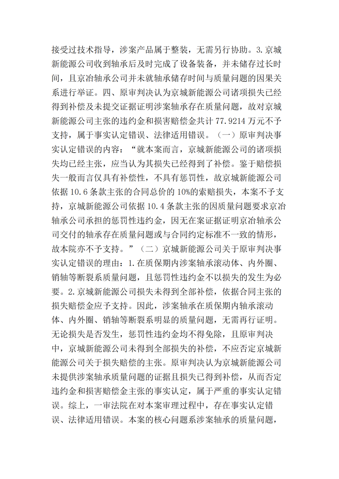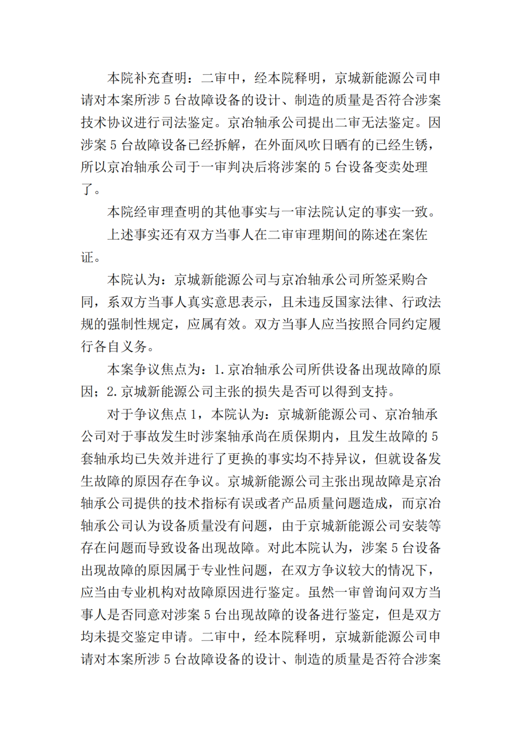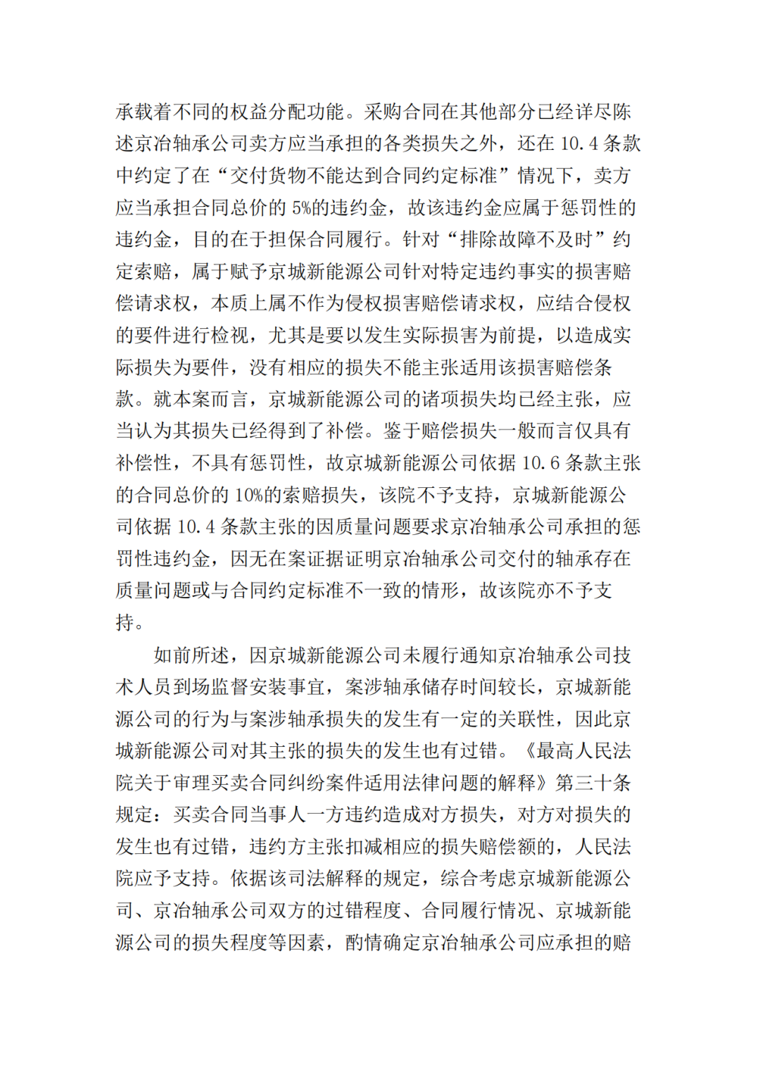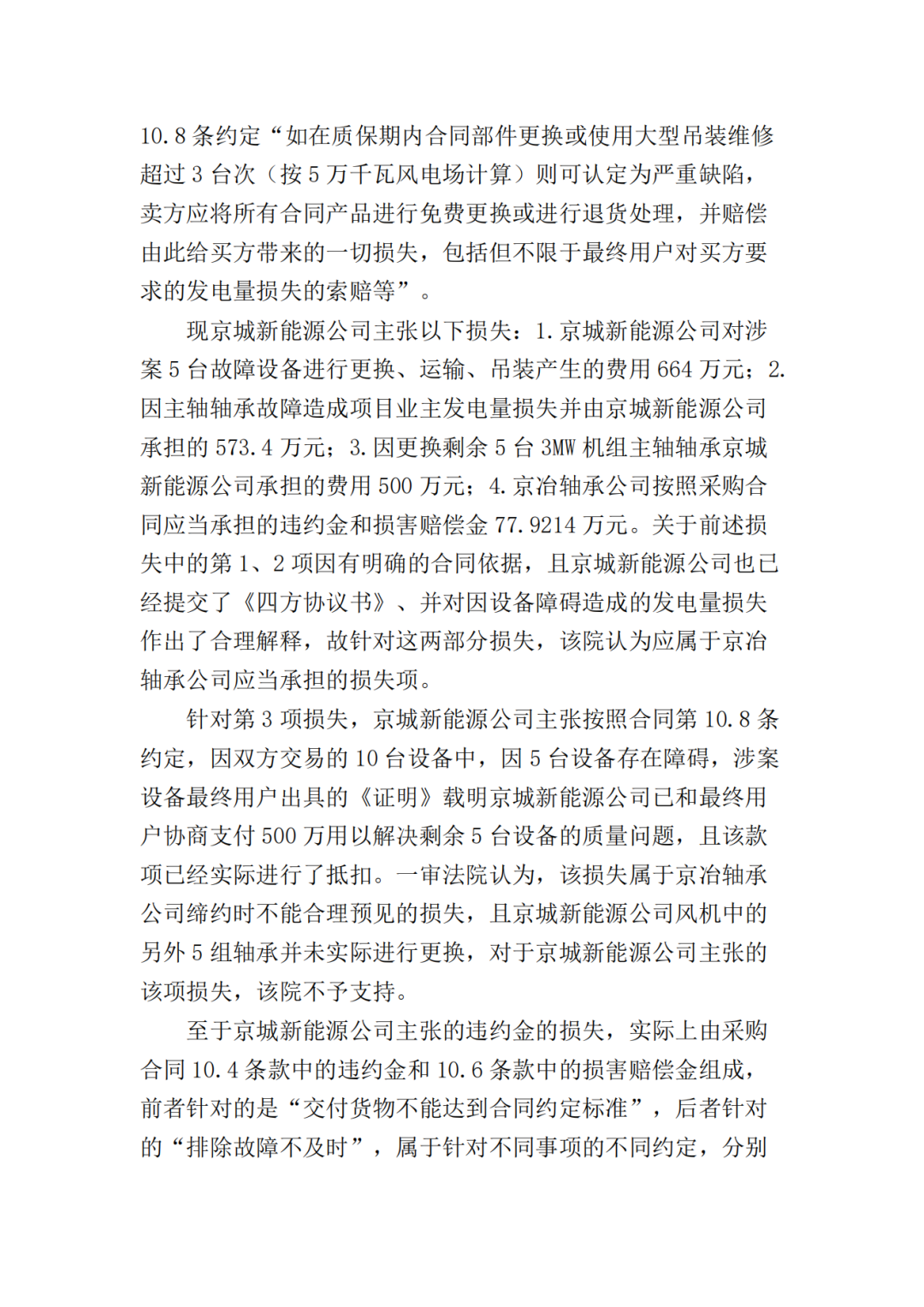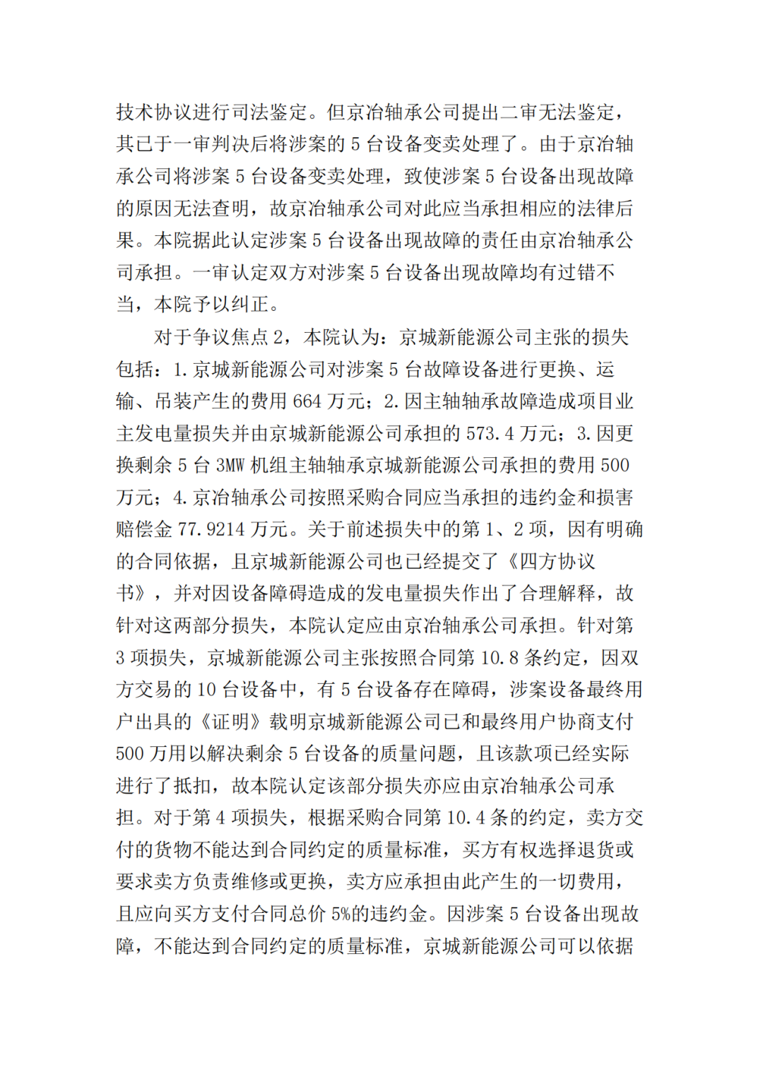 一审法院认为:本案系买卖合同纠纷,京城新能源公司主张京冶轴承公司应承担因履行合同而产生的违约金及诸项损失。针对京城新能源公司诉求,首先应就涉案设备发生故障的原因进行分析,以确定京冶轴承公司是否存在违约行为,其解决的是违约责任归责层面的因果关系问题,即京冶轴承公司是否应当担责的问题;其次是要判断京城新能源公司主张的各项损失与京冶轴承公司违约行为之间的原因力大小,其解决的是违约责任范围层面的因果关系问题,即京冶轴承公司承担责任范围的问题。二审法院认为本案争议焦点为:1.京冶轴承公司所供设备出现故障的原因;2.京城新能源公司主张的损失是否可以得到支持。对于争议焦点1,本院认为:京城新能源公司、京冶轴承公司对于事故发生时涉案轴承尚在质保期内,且发生故障的5套轴承均已失效并进行了更换的事实均不持异议,但就设备发生故障的原因存在争议。京城新能源公司主张出现故障是京冶轴承公司提供的技术指标有误或者产品质量问题造成,而京冶轴承公司认为设备质量没有问题,由于京城新能源公司安装等存在问题而导致设备出现故障。对此本院认为,涉案5台设备出现故障的原因属于专业性问题,在双方争议较大的情况下,应当由专业机构对故障原因进行鉴定。虽然一审曾询问双方当事人是否同意对涉案5台出现故障的设备进行鉴定,但是双方均未提交鉴定申请。二审中,经本院释明,京城新能源公司申请对本案所涉5台故障设备的设计、制造的质量是否符合涉案技术协议进行司法鉴定。但京冶轴承公司提出二审无法鉴定,其已于一审判决后将涉案的5台设备变卖处理了。由于京冶轴承公司将涉案5台设备变卖处理,致使涉案5台设备出现故障的原因无法查明,故京冶轴承公司对此应当承担相应的法律后果。本院据此认定涉案5台设备出现故障的责任由京冶轴承公司承担。一审认定双方对涉案5台设备出现故障均有过错不当,本院予以纠正。对于争议焦点2,本院认为:京城新能源公司主张的损失包括:1.京城新能源公司对涉案5台故障设备进行更换、运输、吊装产生的费用664万元;2.因主轴轴承故障造成项目业主发电量损失并由京城新能源公司承担的573.4万元;3.因更换剩余5台3**机组主轴轴承京城新能源公司承担的费用500万元;4.京冶轴承公司按照采购合同应当承担的违约金和损害赔偿金77.9214万元。关于前述损失中的第1、2项,因有明确的合同依据,且京城新能源公司也已经提交了《四方协议书》,并对因设备障碍造成的发电量损失作出了合理解释,故针对这两部分损失,本院认定应由京冶轴承公司承担。针对第3项损失,京城新能源公司主张按照合同第10.8条约定,因双方交易的10台设备中,有5台设备存在障碍,涉案设备最终用户出具的《证明》载明京城新能源公司已和最终用户协商支付500万用以解决剩余5台设备的质量问题,且该款项已经实际进行了抵扣,故本院认定该部分损失亦应由京冶轴承公司承担。对于第4项损失,根据采购合同第10.4条的约定,卖方交付的货物不能达到合同约定的质量标准,买方有权选择退货或要求卖方负责维修或更换,卖方应承担由此产生的一切费用,且应向买方支付合同总价5%的违约金。因涉案5台设备出现故障,不能达到合同约定的质量标准,京城新能源公司可以依据采购合同的约定向京冶轴承公司主张承担合同总价的5%的违约金,即259738元,故对于京城新能源公司主张的该部分违约金请求,本院予以支持。鉴于京城新能源公司按照10.6条款主张的合同总价的10%的索赔损失,本院已经支持其请求的3项损失,故京城新能源公司主张的该部分索赔损失,本院对此不予支持。京城新能源公司上诉的相关主张,有合同及事实依据,本院对此予以支持。