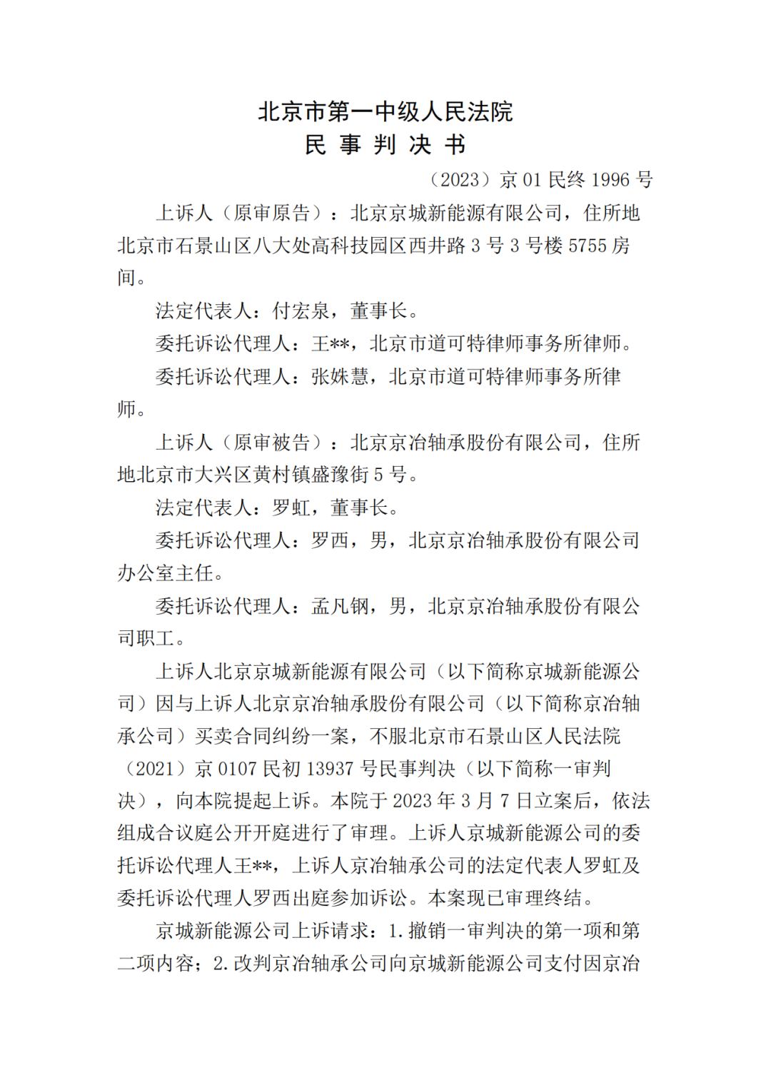 日前,北京市第一中级人民法院发布北京京冶轴承股份有限公司等买卖合同纠纷二审民事判决书。