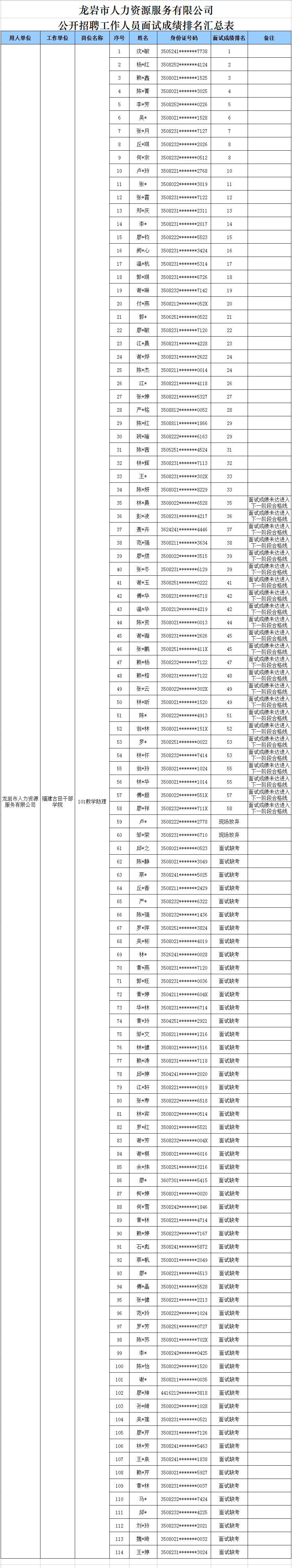 根据2023年7月13日发布的《龙岩市人力资源服务有限公司公开招聘工作人员公告》有关要求,龙岩市人力资源服务有限公司教学助理(岗位代码101)考试(面试)环节已经我司组织完成,现将面试成绩排名予以公示。