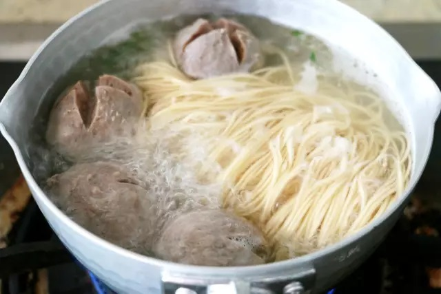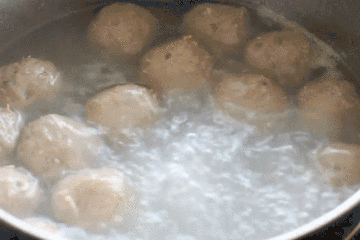 随后,捻住肉浆,握拳从拇指和食指中挤出丸状,用勺掏进温水盆,慢火煮熟便可以出锅了。