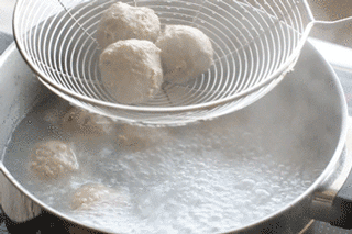 挤出来的丸子马上用汤匙舀入60-65℃的恒温水里定形。最后再用90℃左右的牛骨汤煮大约15分钟。